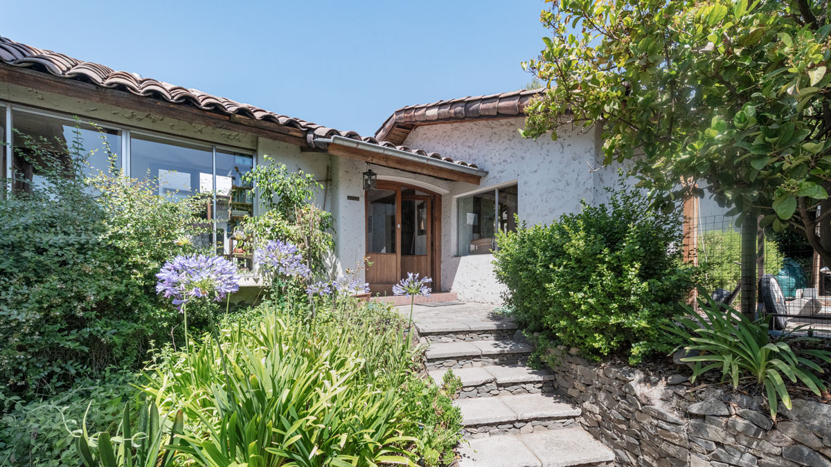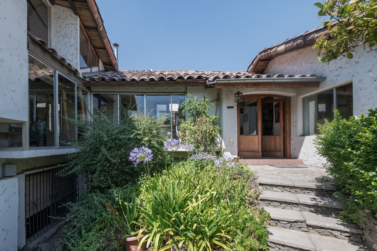 Asimismo, por un costado de la propiedad, nos dirigimos a la entrada principal de la casa que nos recibe con una linda escalera y jardín. El vestíbulo está acompañado de un patio interior, ambos ubicados al centro de la casa. Desde aquí se accede directamente al comedor, por un costado al living y por otro al pasillo que dirige a la zona de los dormitorios. Tanto el comedor como el living tienen salida a una cómoda y funcional terraza techada junto a un bien mantenido jardín con riego automático. Desde el living se distingue una vista panorámica a distancia del Cerro San Cristóbal, como continuidad del jardín.