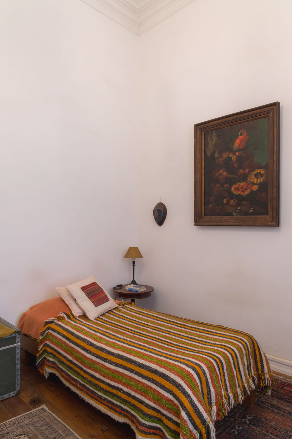 Al acceder por el primer piso, encontramos un foyer de distribución; por una parte, encontramos el primer dormitorio en suite y, por otra, se unieron dos habitaciones que dieron origen a una gran espacio. Desde aquí accedemos al patio, un lugar rodeado de un jardín vertical que crece entre los muros de piedra original. En esta galería se conservó el muro original de adobe el cual no fue cubierto para así acusar el alma estructural de la casa. En esta zona hay tres salas más y un baño; además de un polvorín descubierto el año 1740.