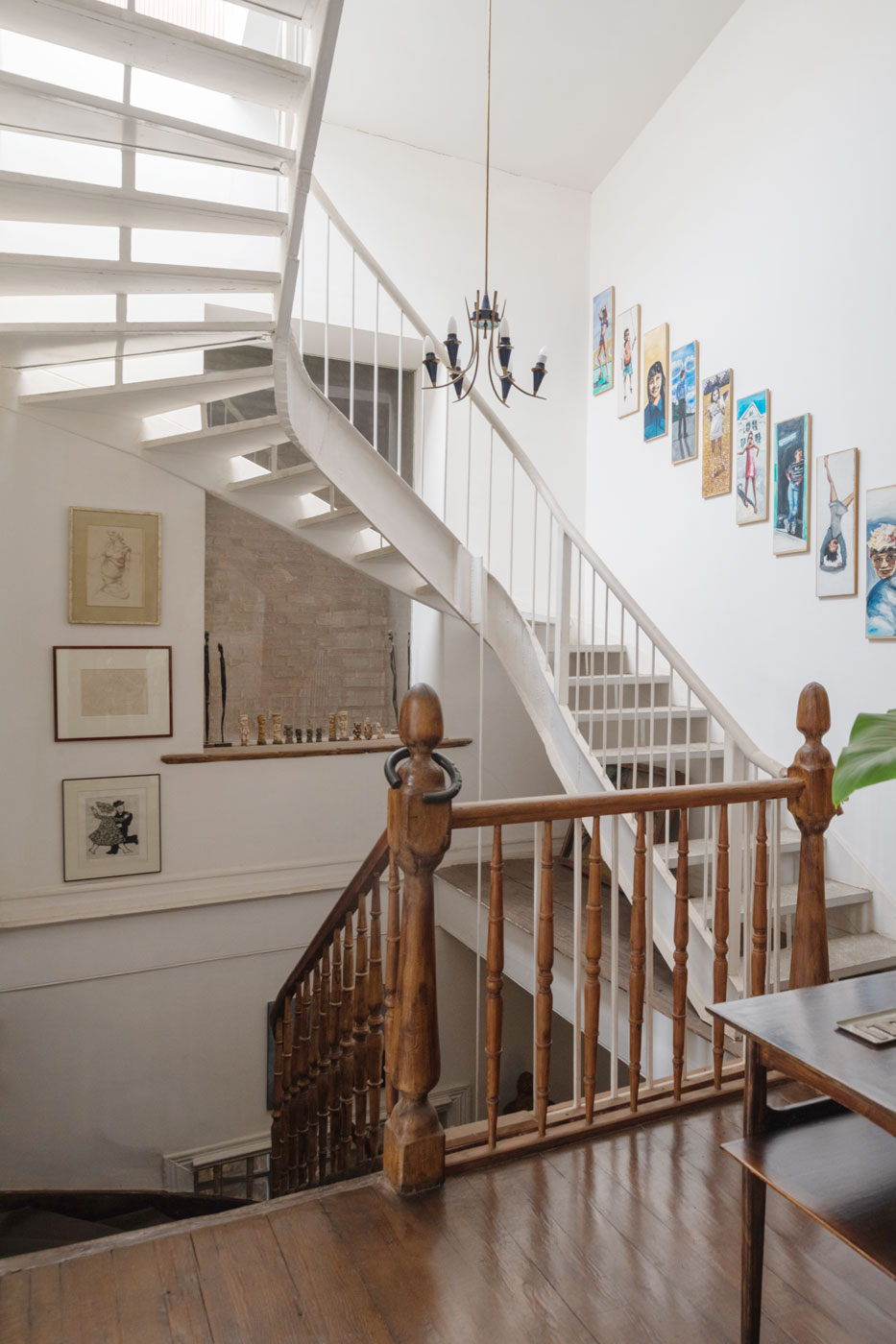 Por la escalera original de madera, llegamos al segundo piso, donde encontramos el living y biblioteca; espacios contemplativos. Luego está el comedor y la cocina que se integran con un gran mesón de roble. También aquí hay un segundo dormitorio en suite.