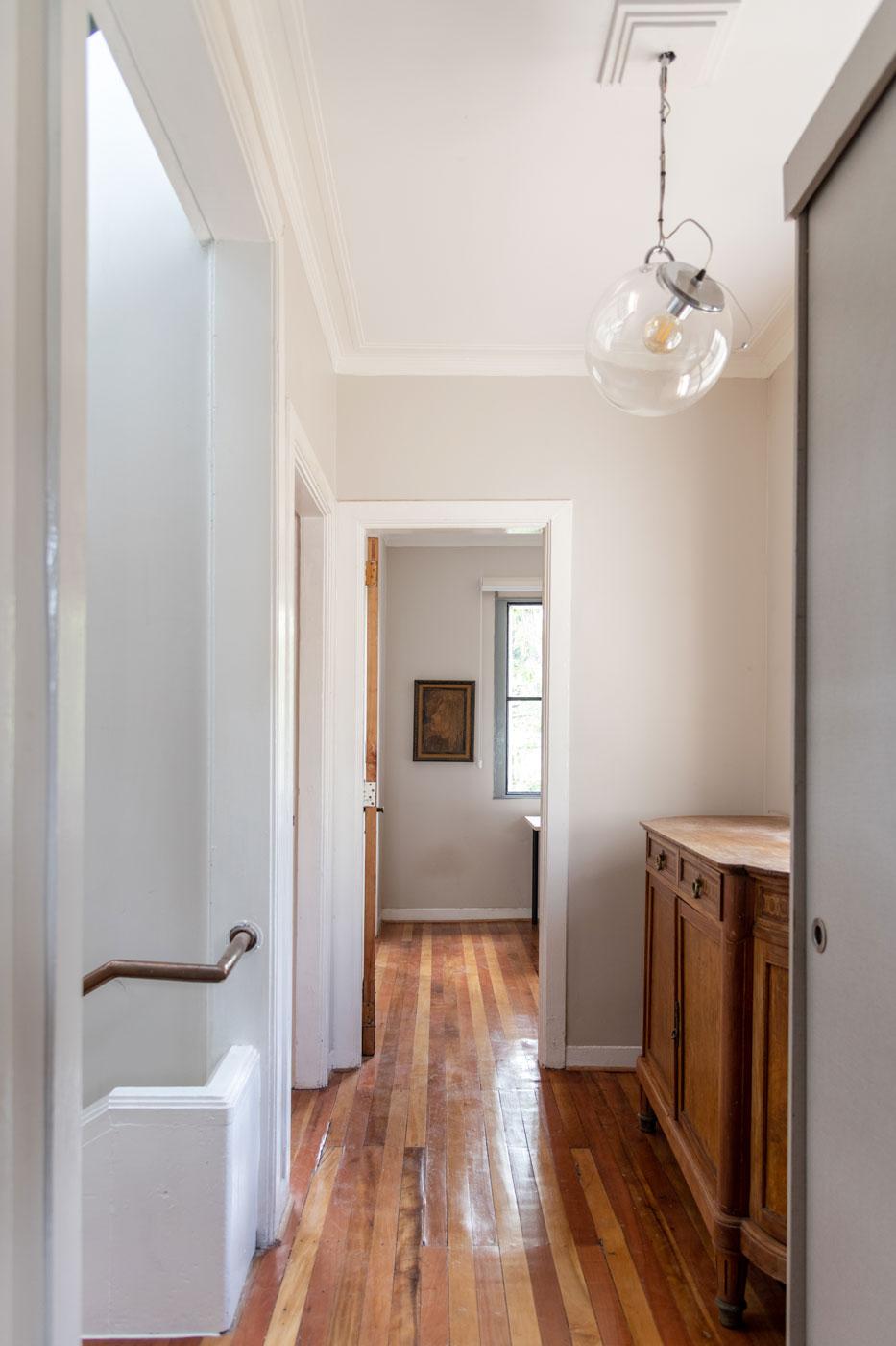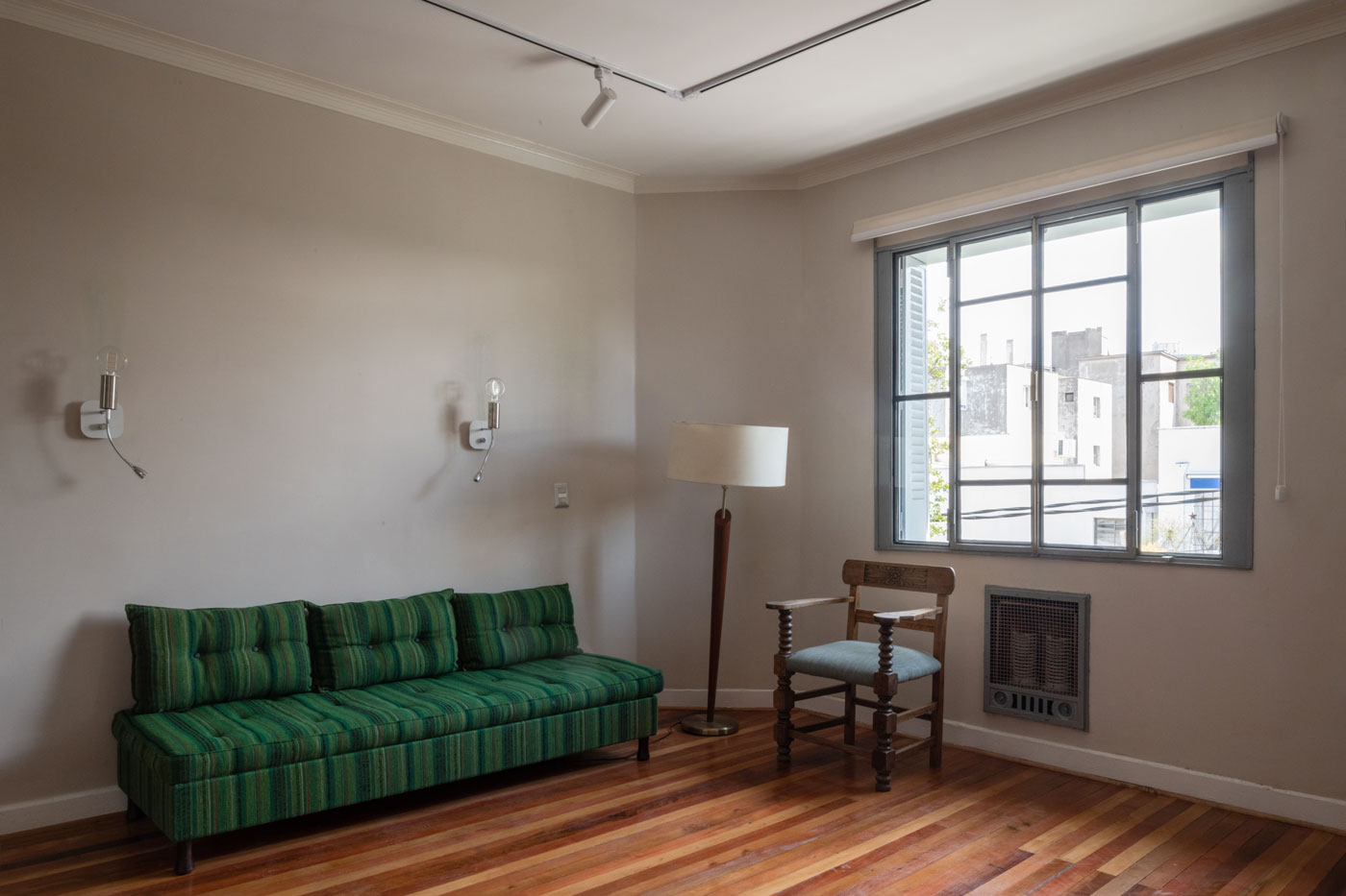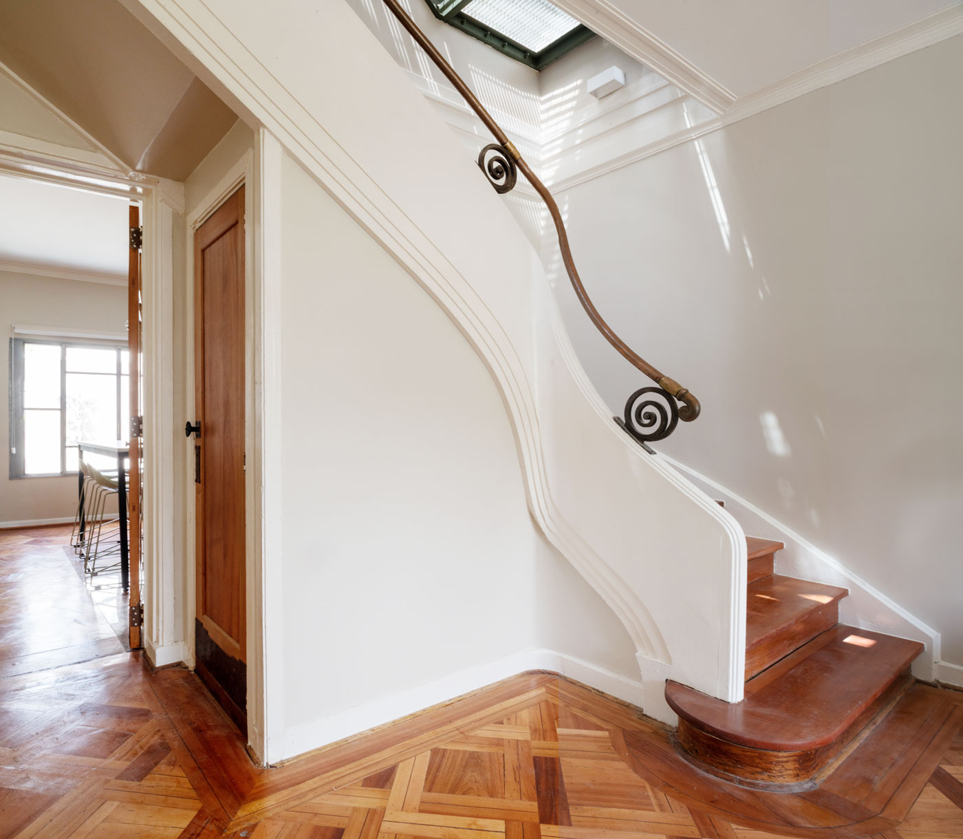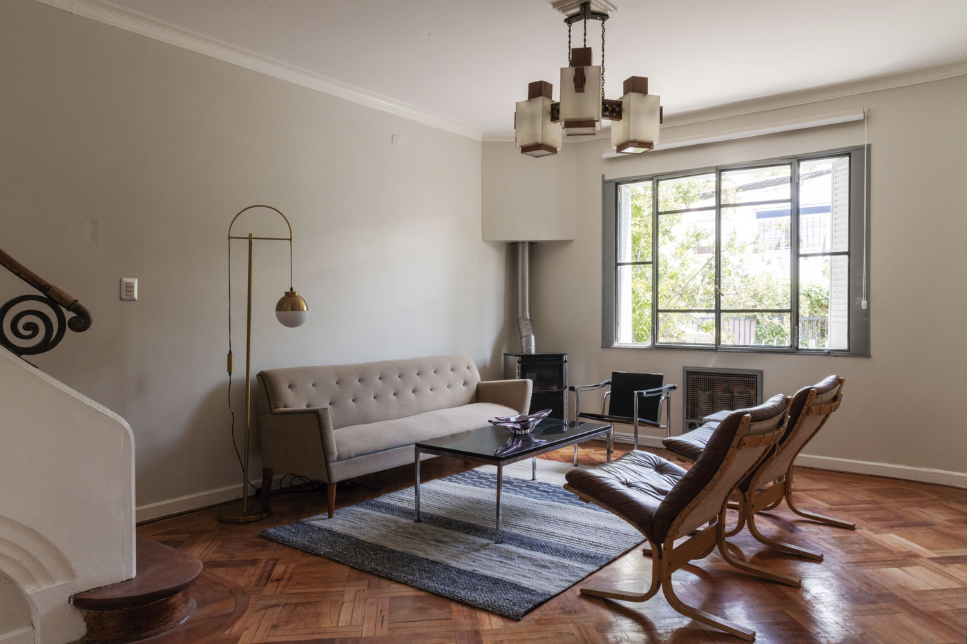 A la casa de 120 mts2, se accede por un iluminado y amplio hall de distribución, desde donde entramos a un living con orientación norte, doble altura y detalles propios de la arquitectura de Kulczewski, tales como la escultórica escalera hacia el segundo piso.