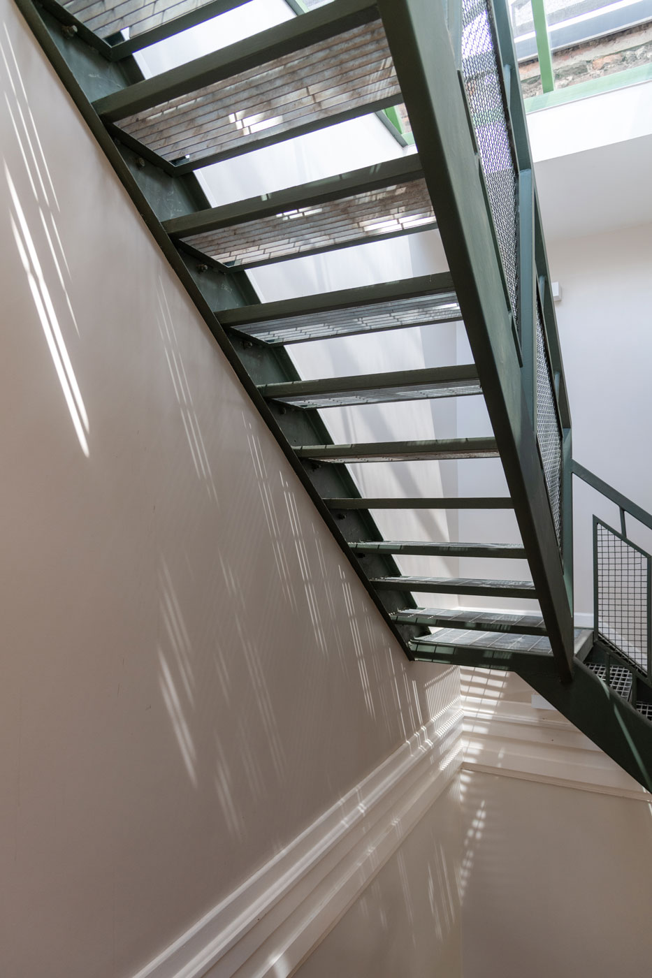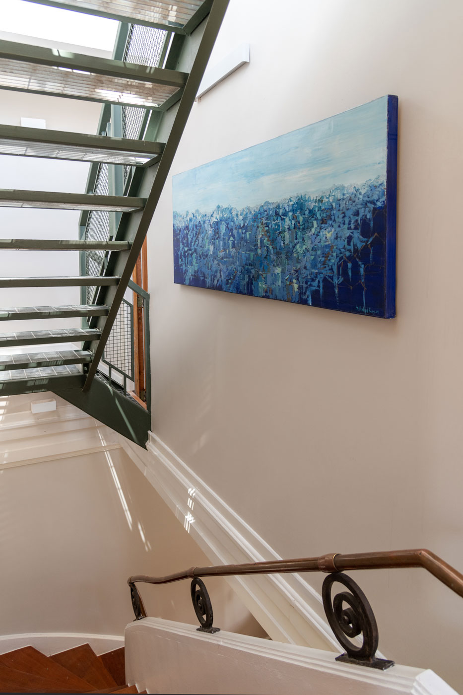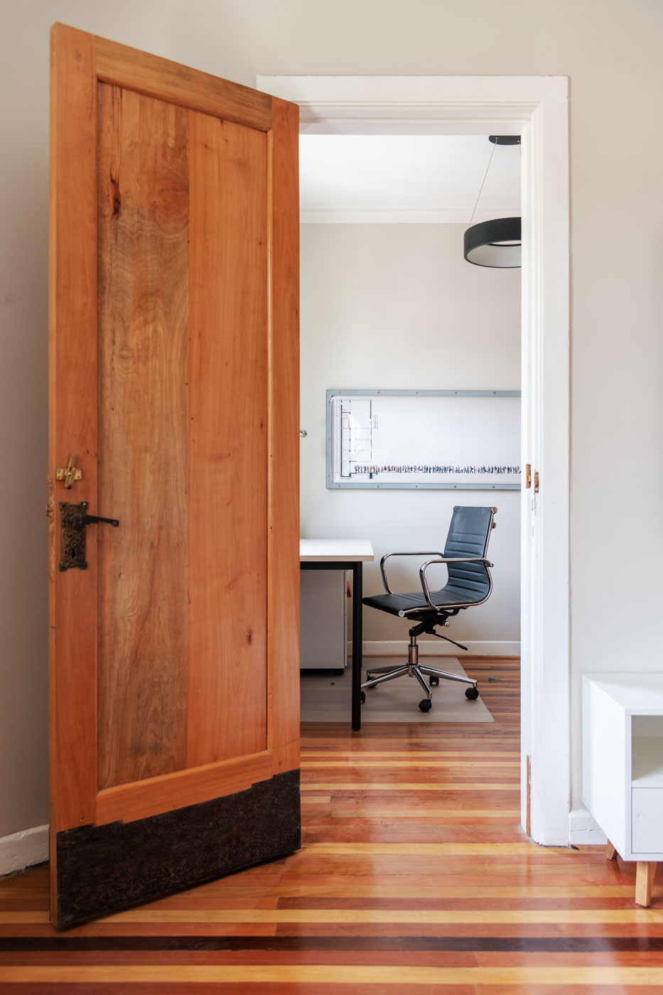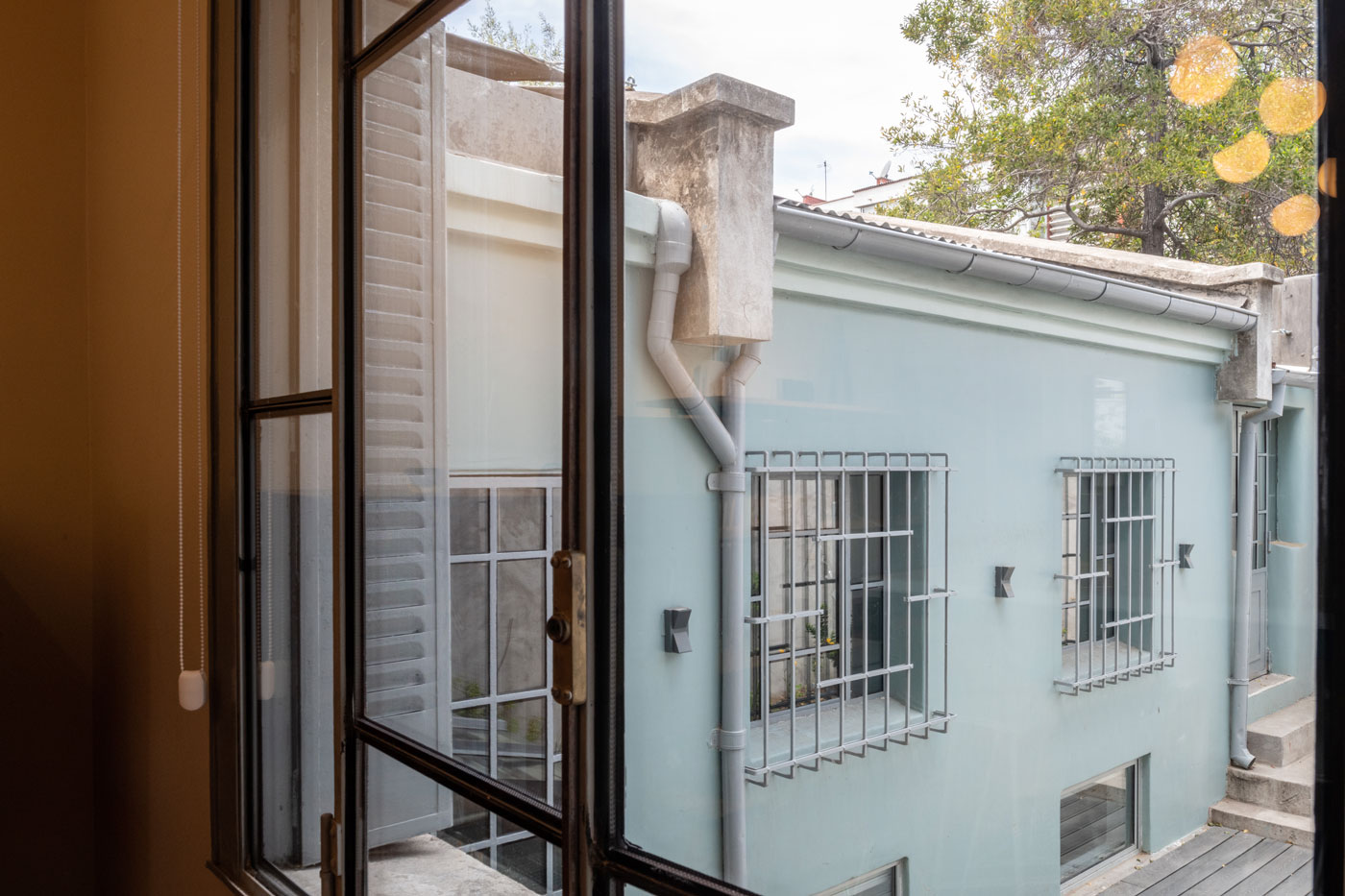 A la casa de 120 mts2, se accede por un iluminado y amplio hall de distribución, desde donde entramos a un living con orientación norte, doble altura y detalles propios de la arquitectura de Kulczewski, tales como la escultórica escalera hacia el segundo piso.