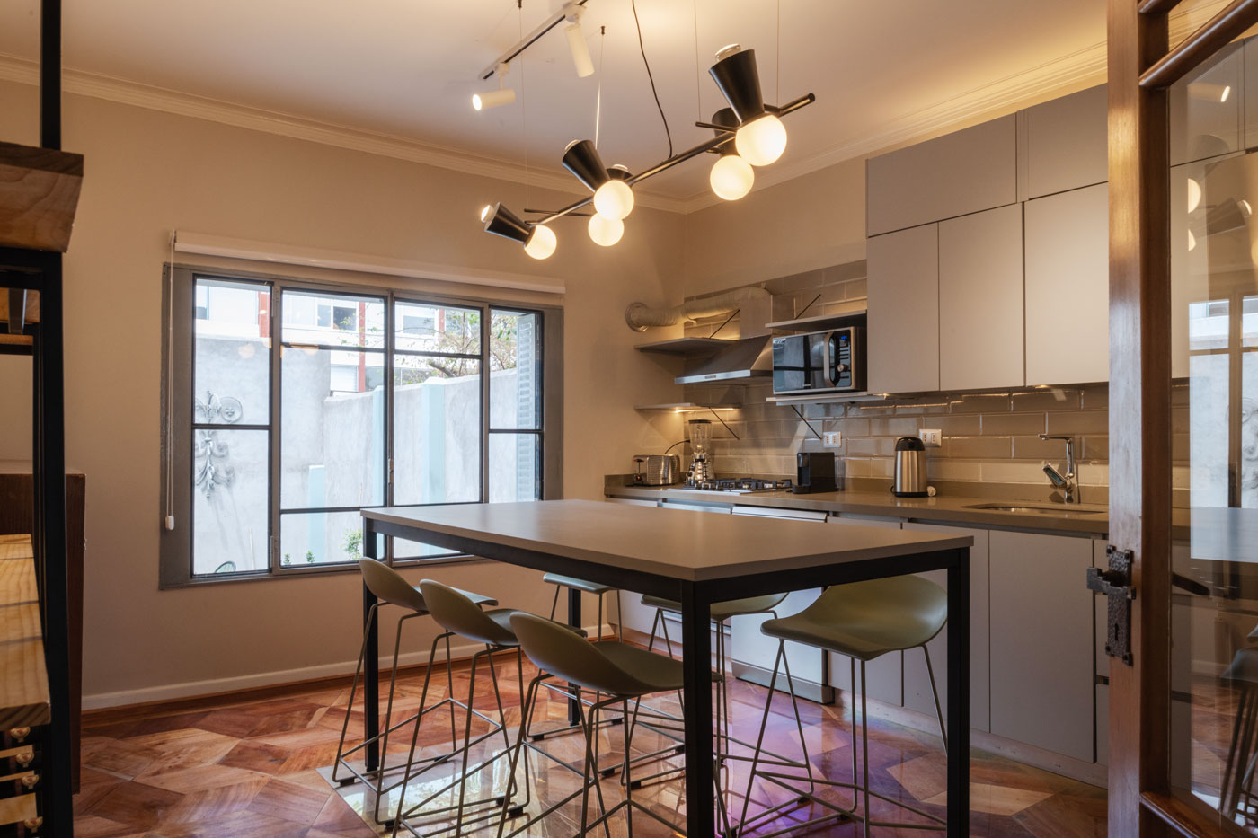 A continuación del living encontramos una moderna y funcional cocina/comedor, que sigue esta coherente línea de diseño. Tiene una agradable vista a un patio trasero. Sus muebles con cubiertas de piedra y sus electrodomésticos la convierten en un extraordinario espacio para estar en la casa. En el primer piso, además, hay un baño completo con ventana.