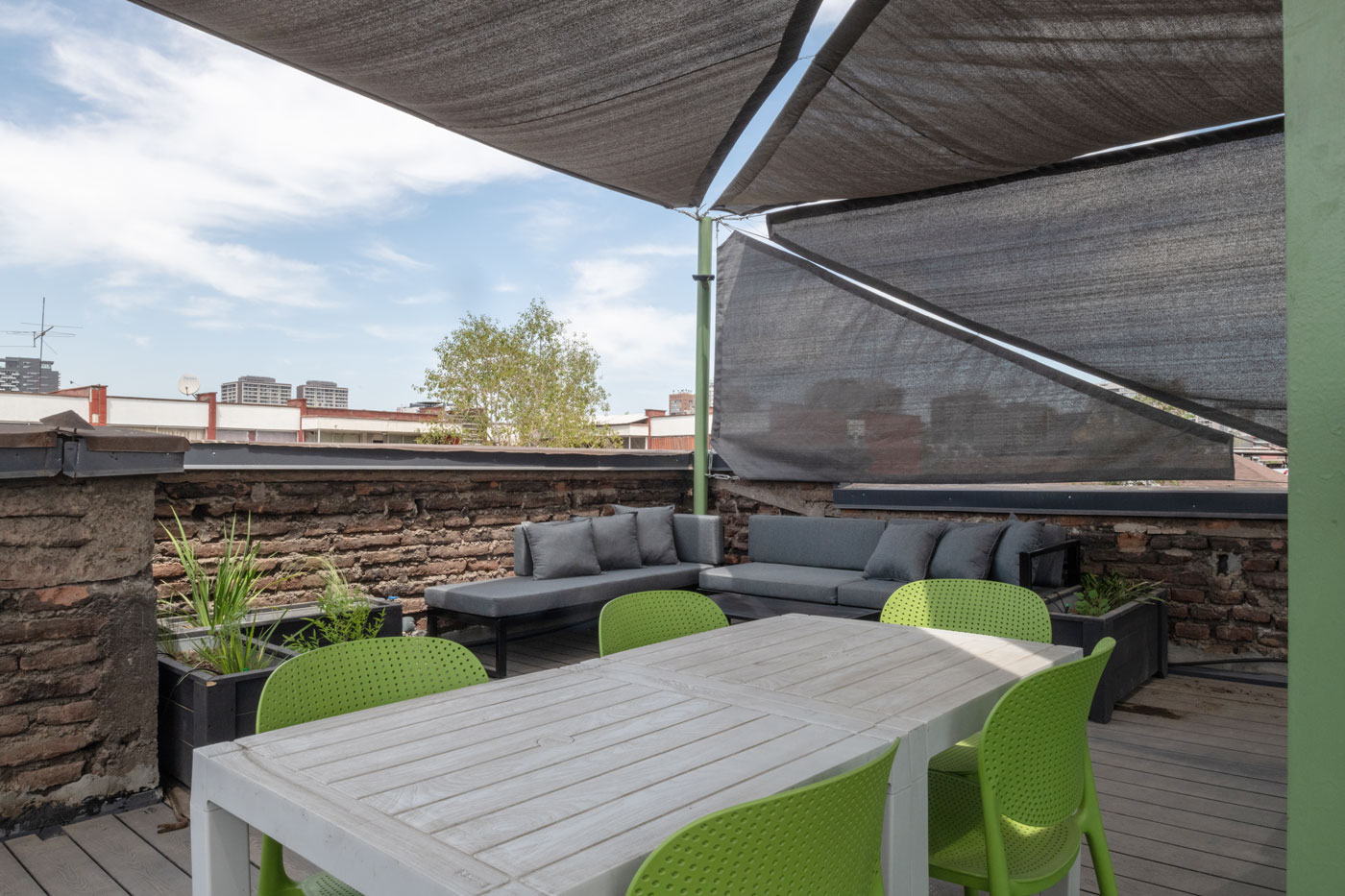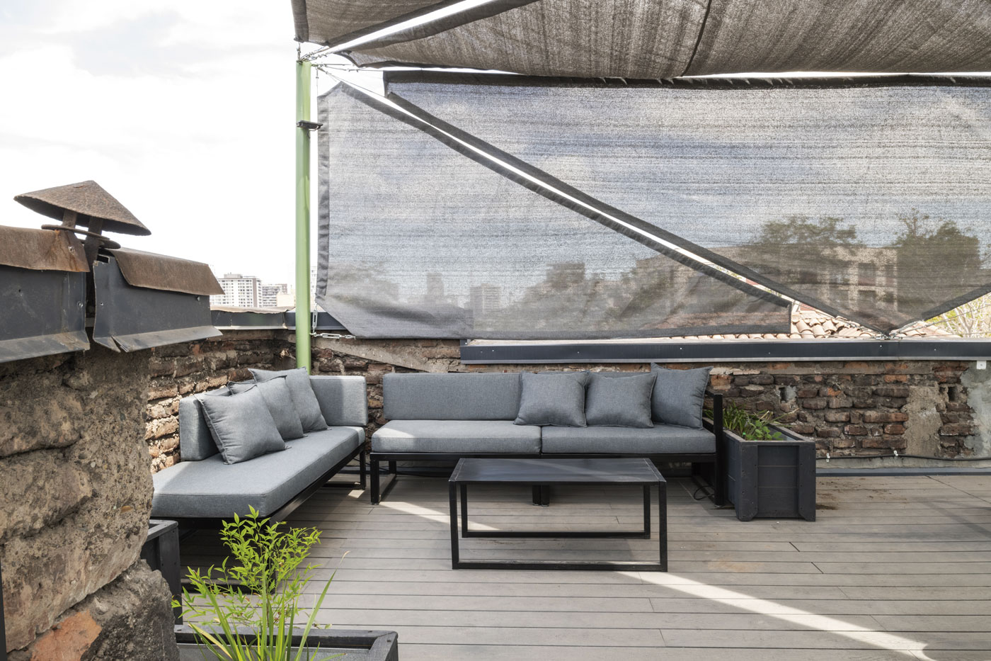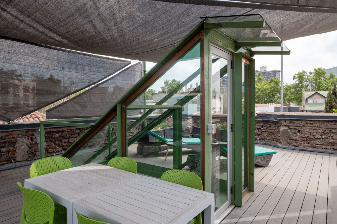 La terraza del tercer piso mide 40mts2 y tiene techo de velas, un deck como piso y espacios muy agradables para disfrutar las tardes de Santiago.