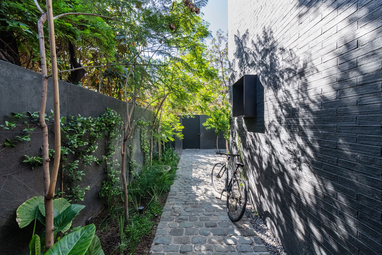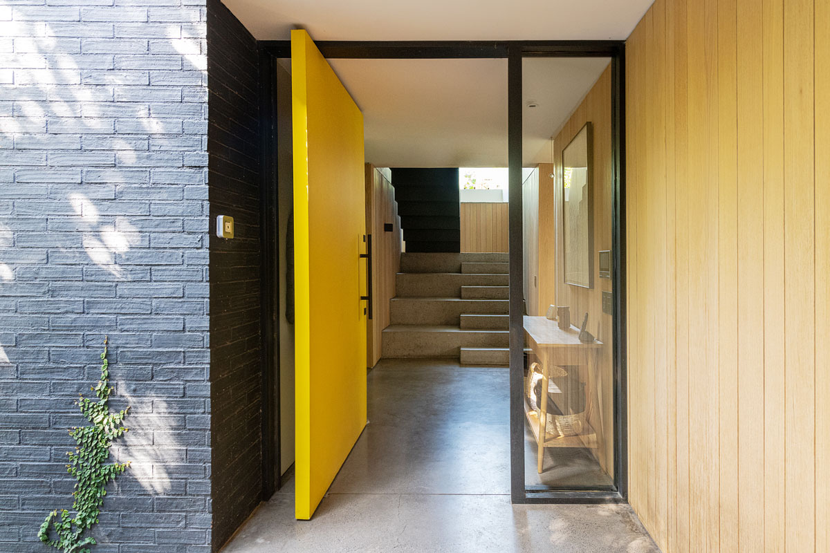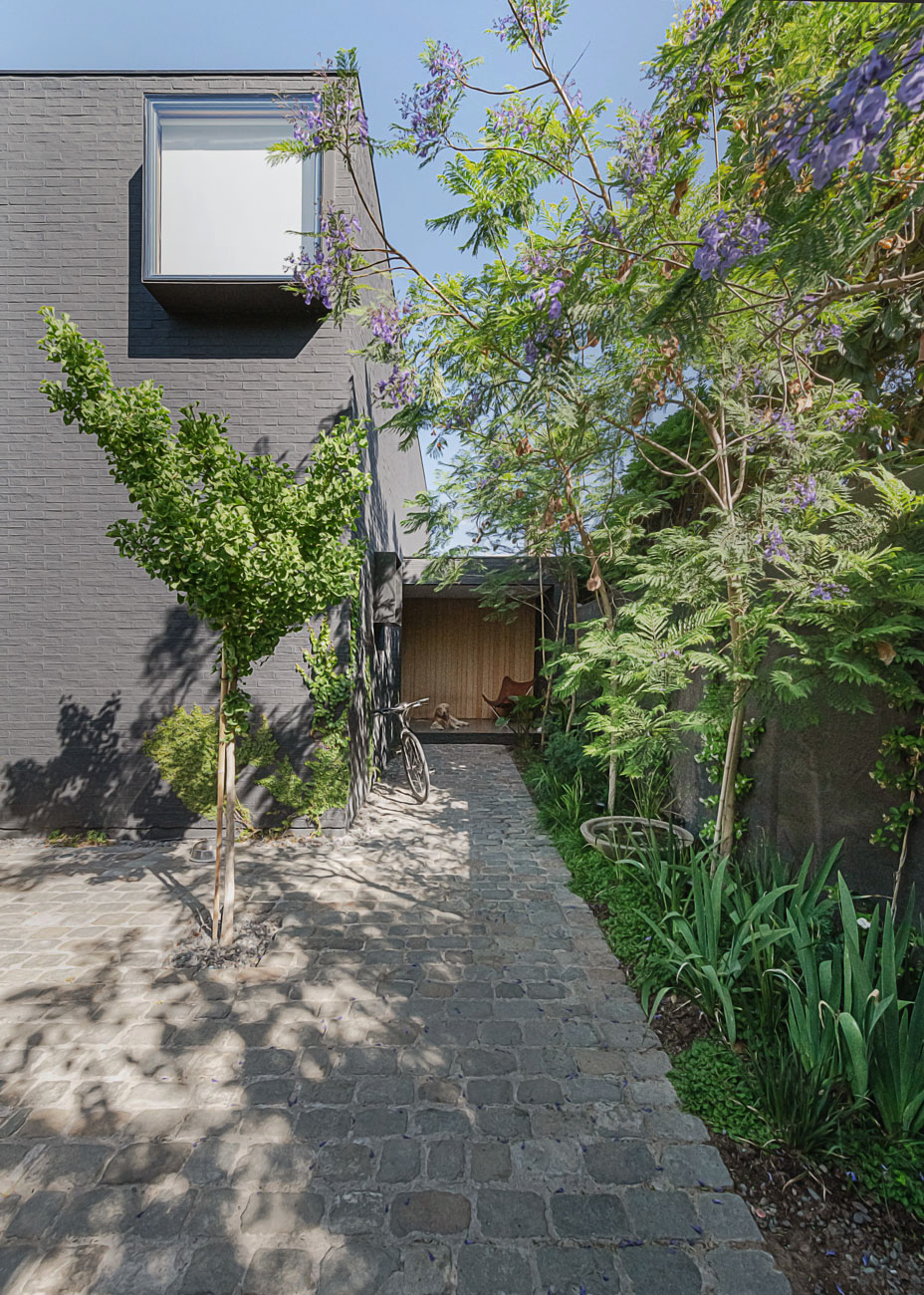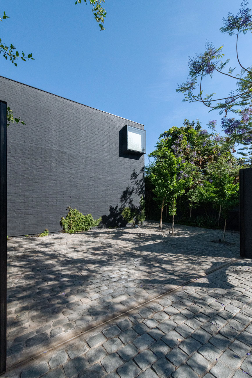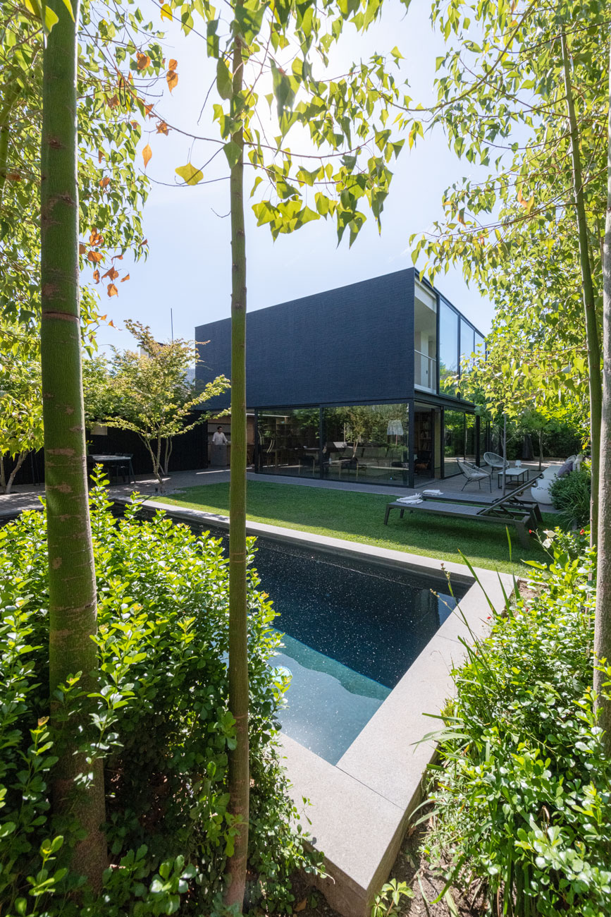 En una de sus tranquilas calles, fue proyectada en 2020 por la reconocida oficina Winckler Arquitectos Asociados http://waa.cl, esta casa de arquitectura contemporánea con fachada de ladrillos pintados negro. Su entrada, por un portón de acceso automatizado, de origen italiano y de alta velocidad, nos conduce a un antejardín y estacionamiento adoquinado. A continuación, a un zaguán revestido en madera de encina casi escultórico, por la disposición de sus maderas de diferentes anchos.