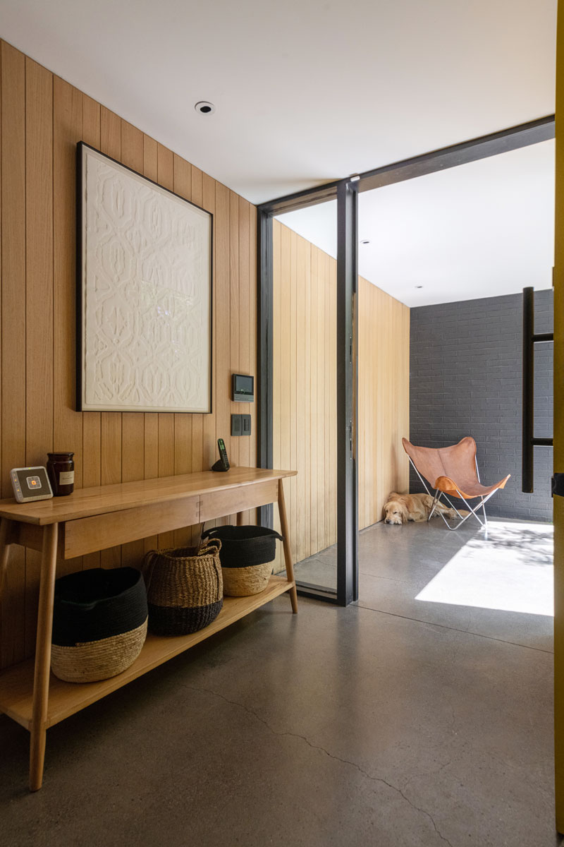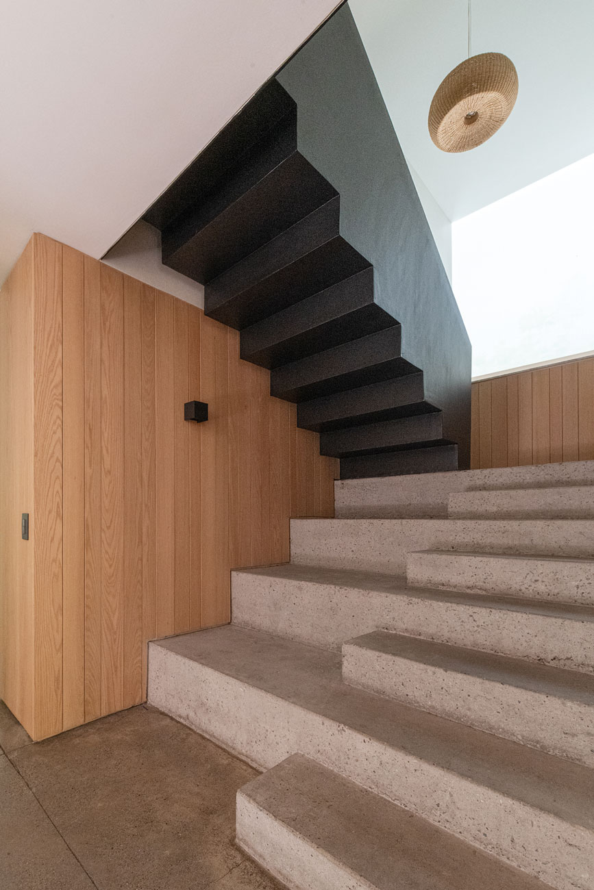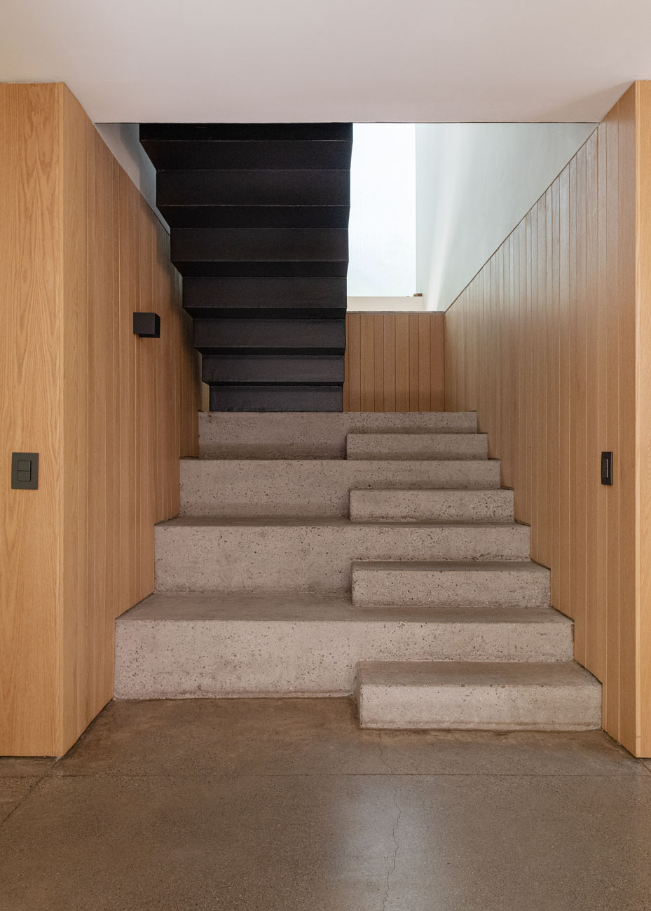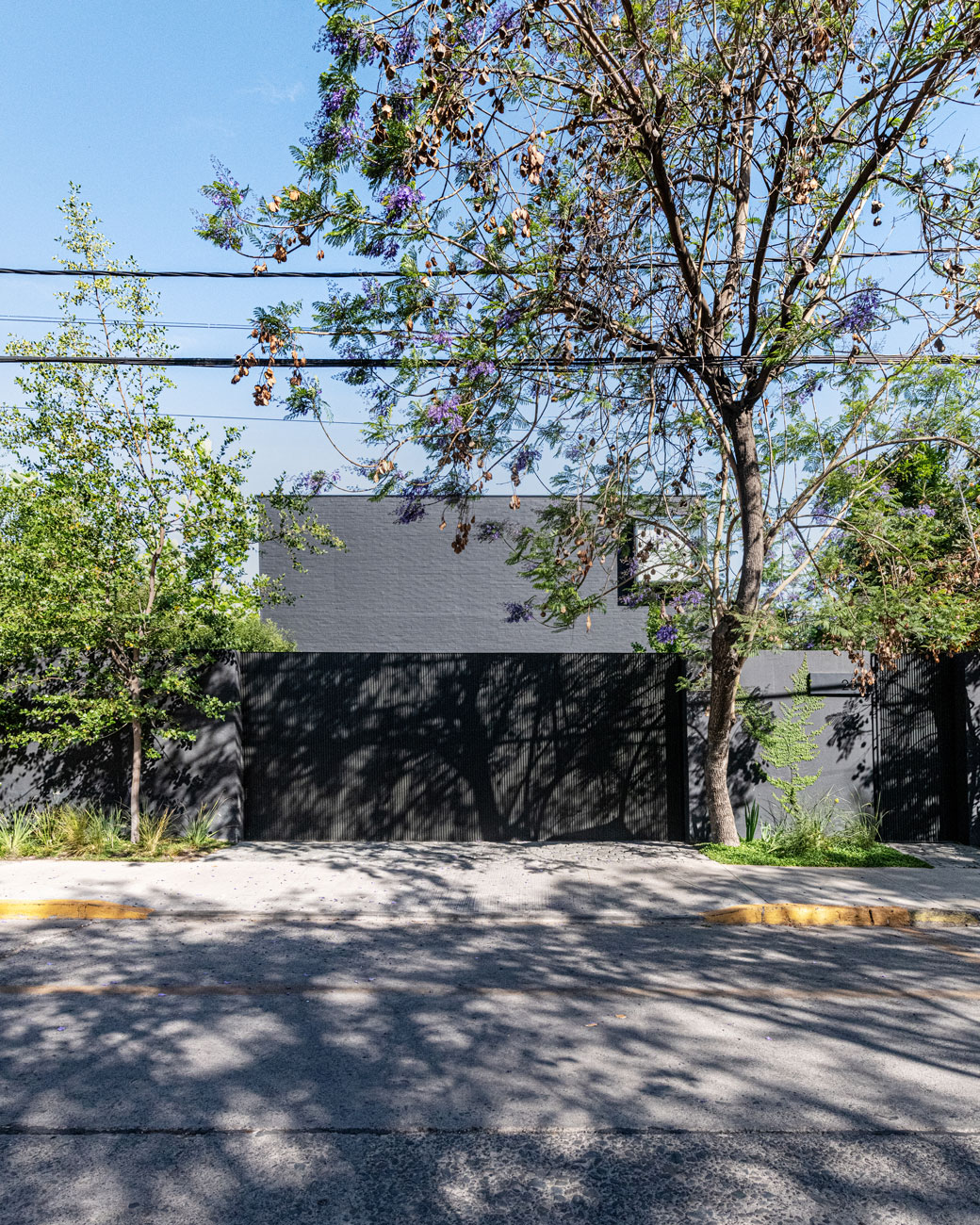 En una de sus tranquilas calles, fue proyectada en 2020 por la reconocida oficina Winckler Arquitectos Asociados http://waa.cl, esta casa de arquitectura contemporánea con fachada de ladrillos pintados negro. Su entrada, por un portón de acceso automatizado, de origen italiano y de alta velocidad, nos conduce a un antejardín y estacionamiento adoquinado. A continuación, a un zaguán revestido en madera de encina casi escultórico, por la disposición de sus maderas de diferentes anchos.