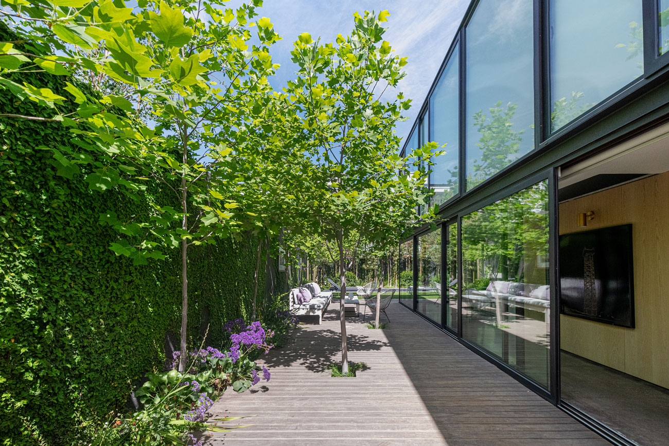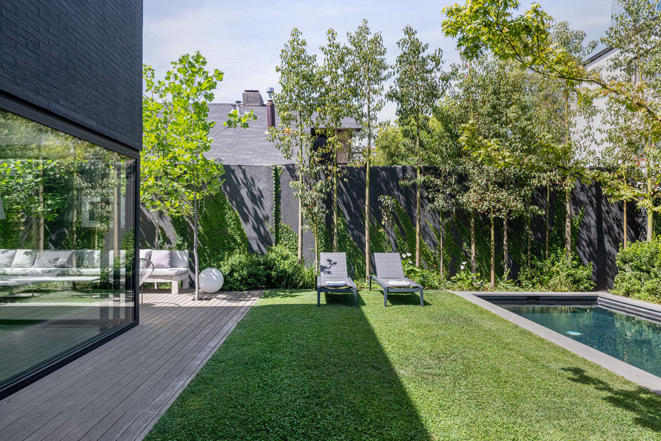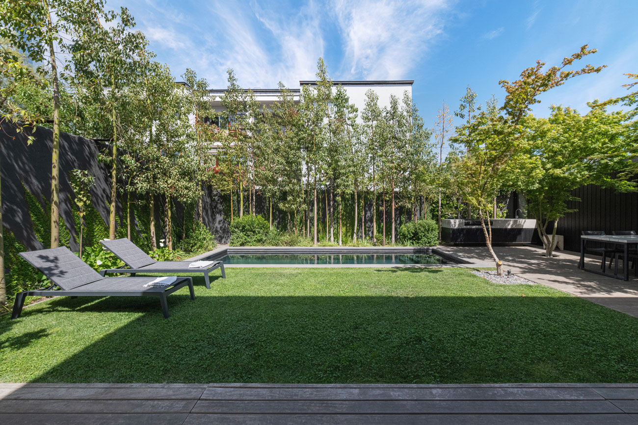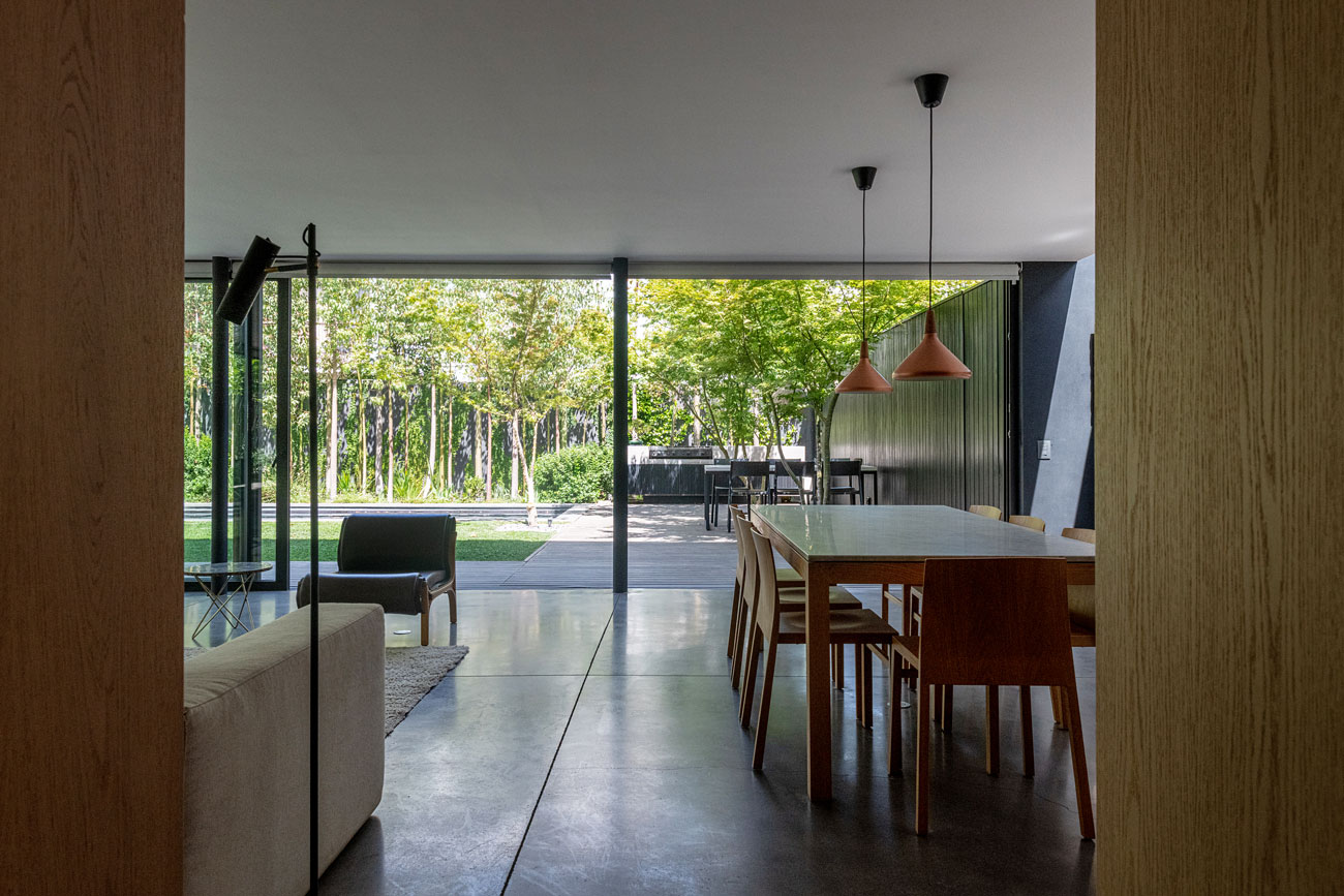 El jardín, por su parte, bordea la fachada oriente con una hilera de tuliperos, pastelones y un sector con deck de madera termo tratada Topwood donde se ubica el estar exterior. El prado y la piscina en el área sur oriente de la casa cuenta con un sector tipo quincho con parrilla a gas Al Fuego y, además, un comedor exterior de pastelones. El paisajismo, con especies nativas de preferencia, permite dar sombra a los lugares de estar y sol a la piscina que, además, cuenta con calefactores solares para mantenerla a una temperatura agradable todo el día. El riego del jardín se encuentra domotizado.
