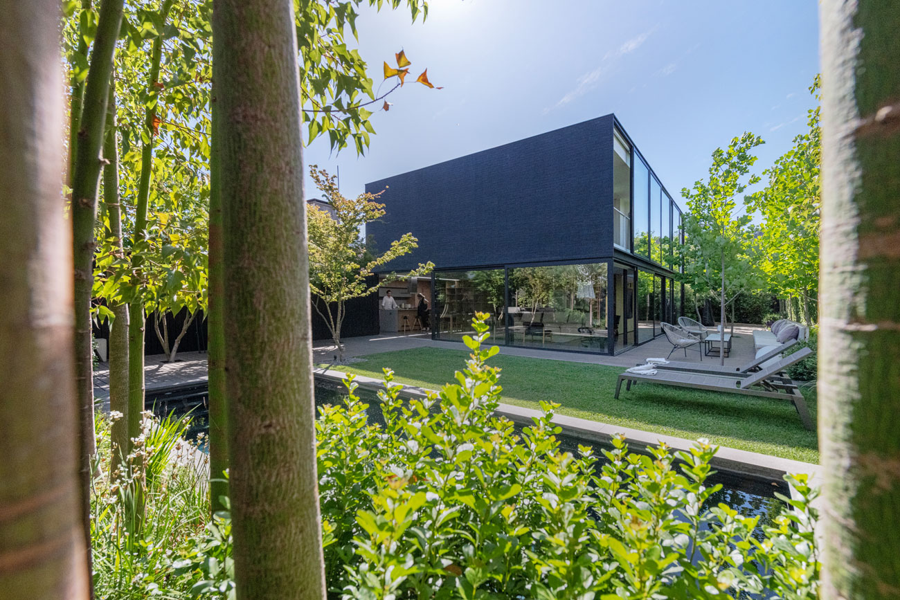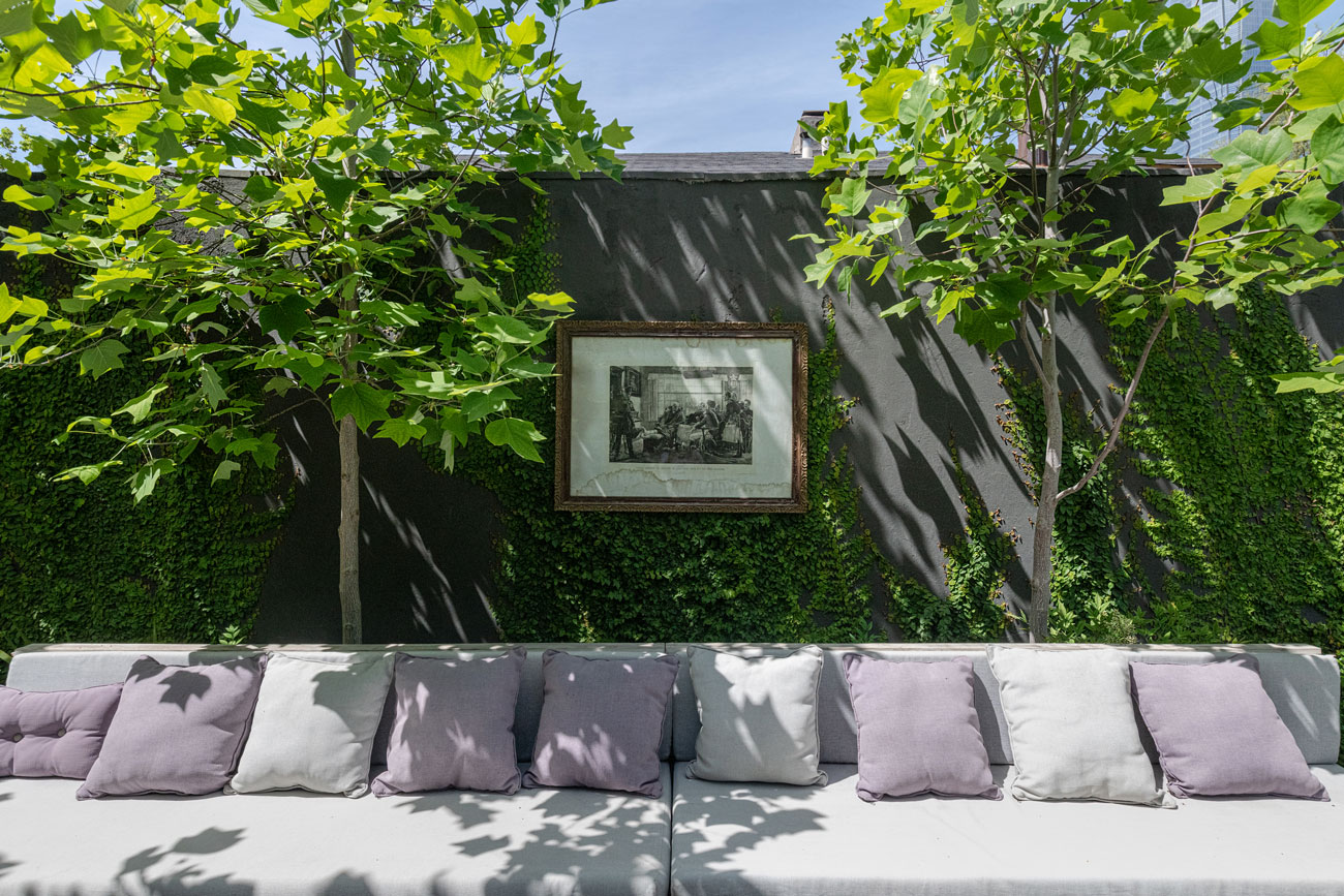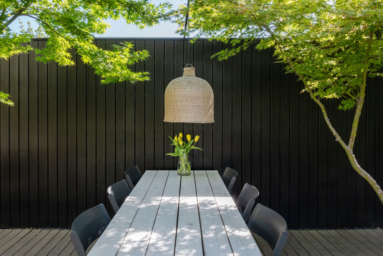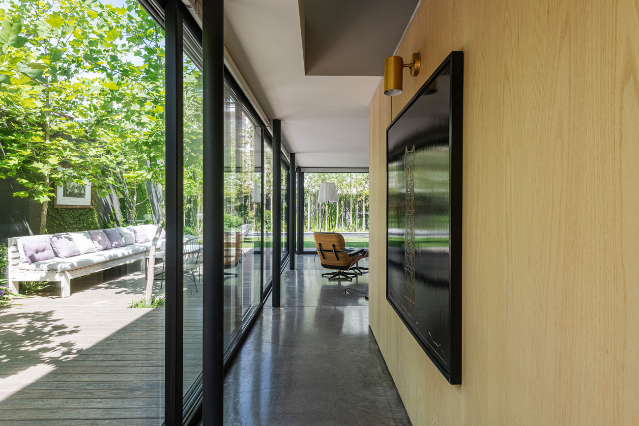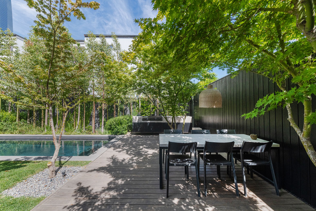 El jardín, por su parte, bordea la fachada oriente con una hilera de tuliperos, pastelones y un sector con deck de madera termo tratada Topwood donde se ubica el estar exterior. El prado y la piscina en el área sur oriente de la casa cuenta con un sector tipo quincho con parrilla a gas Al Fuego y, además, un comedor exterior de pastelones. El paisajismo, con especies nativas de preferencia, permite dar sombra a los lugares de estar y sol a la piscina que, además, cuenta con calefactores solares para mantenerla a una temperatura agradable todo el día. El riego del jardín se encuentra domotizado.