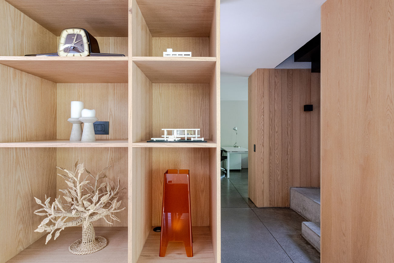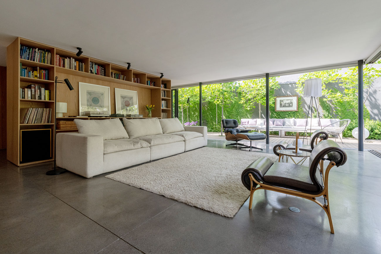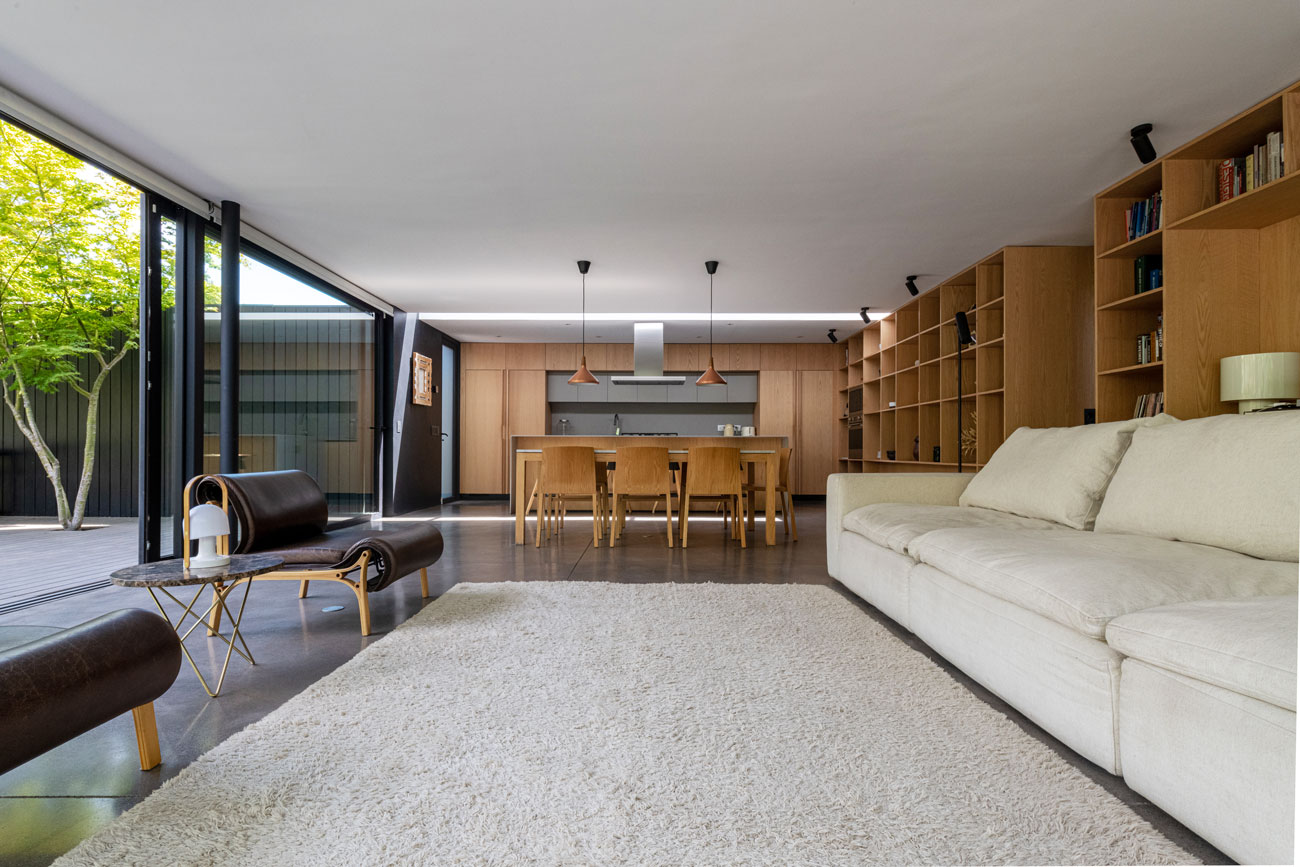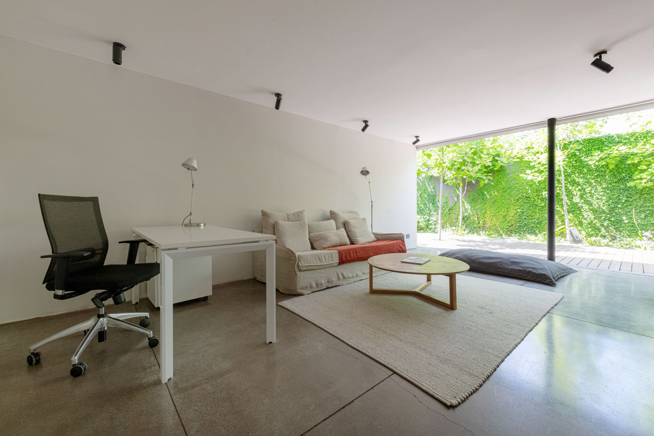 La planta baja cuenta con un gran espacio de living comedor y cocina, conformado por ventanas de PVC belgas de cielo a piso que se abren completamente, permitiendo abrir este espacio hacia el bien cuidado jardín. En este amplio estar, los muebles en obra de encina natural permiten almacenar ordenadamente artículos de uso doméstico, además de exhibir tesoros personales. A su vez, el piso de hormigón pulido Superfloor, en perfecto estado, resalta el mobiliario y da una calidez especial a toda la planta. En este nivel, además, se proyectó una sala de estar y un baño de visita.