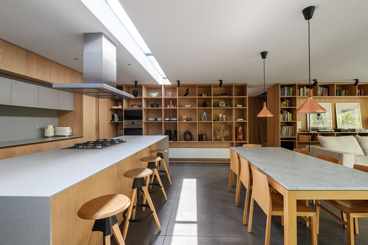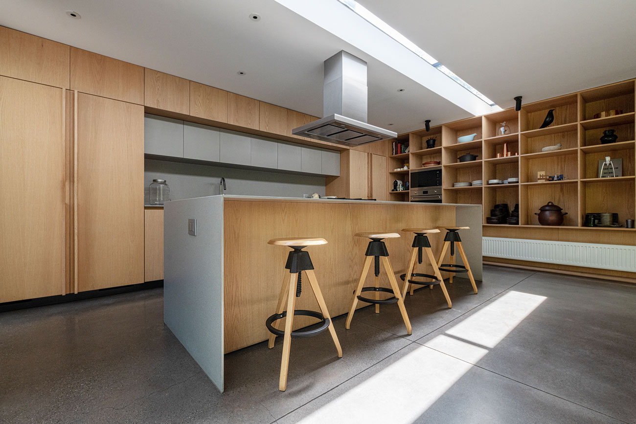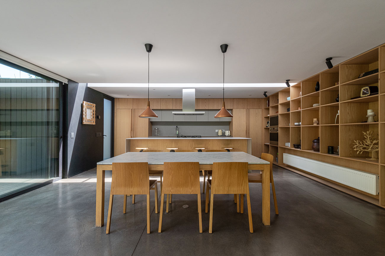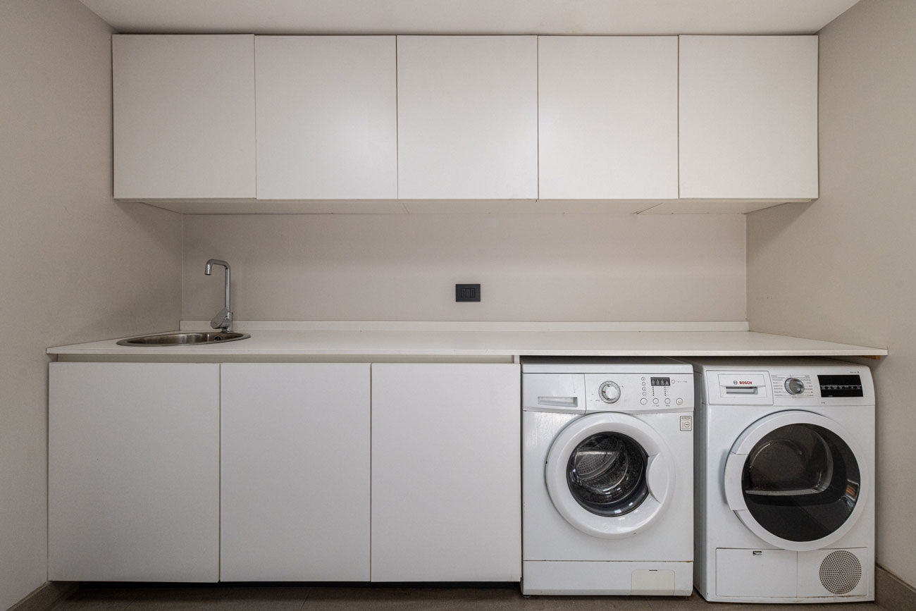 Por su parte, la cocina cuenta con un gran mueble isla iluminado por luz natural, proveniente de un techo vidriado. Cuenta con electrodomésticos de primera categoría, tales como Smeg y Bosch, además de funcionales muebles enchapados en encina y cubiertas Dekton. Desde la cocina se accede a un pabellón de servicios, donde además de una patio duro, hay un amplio lavadero y un dormitorio y baño de servicio con luz natural, y vistas al jardín.