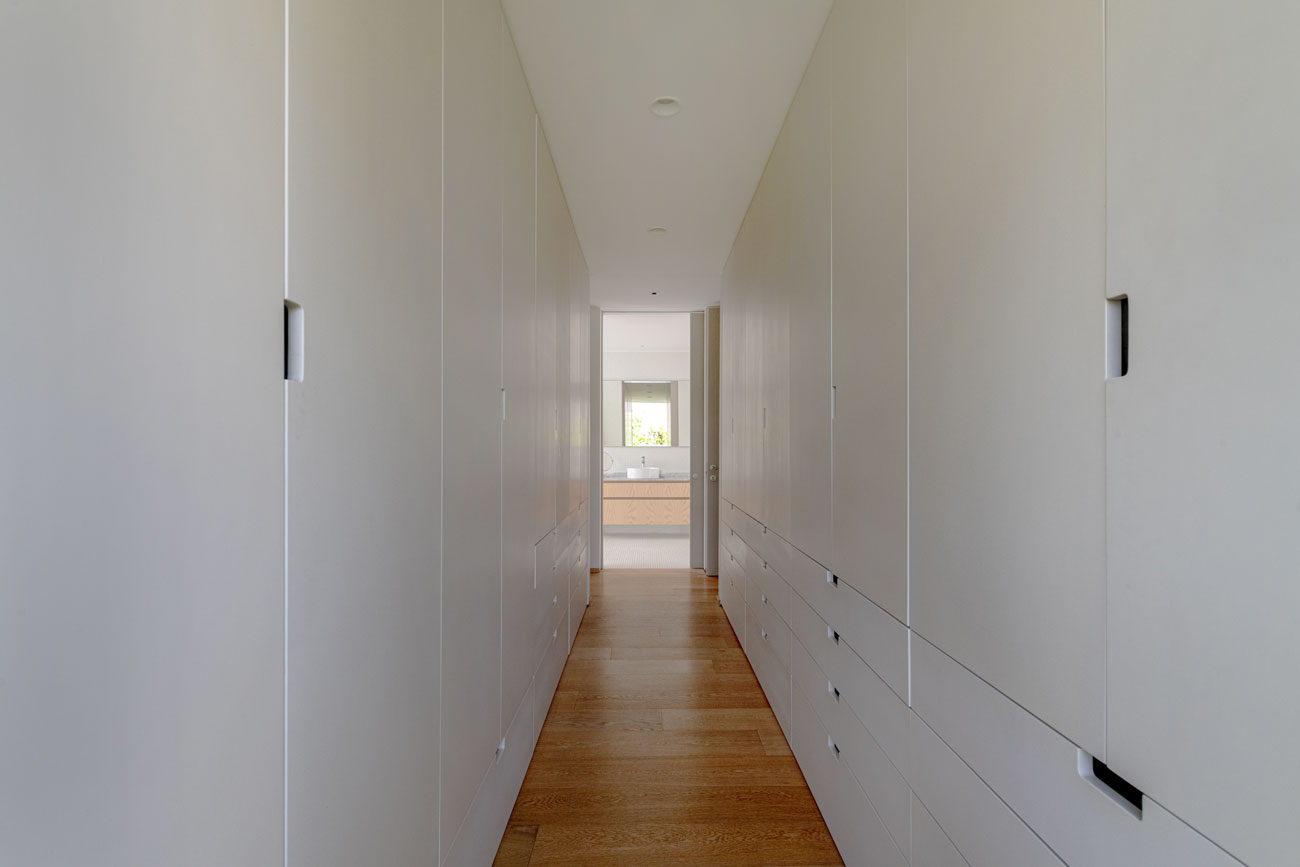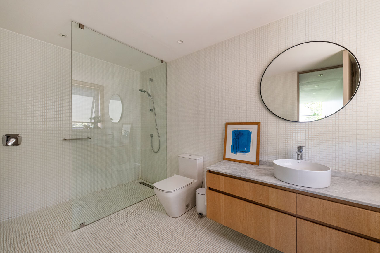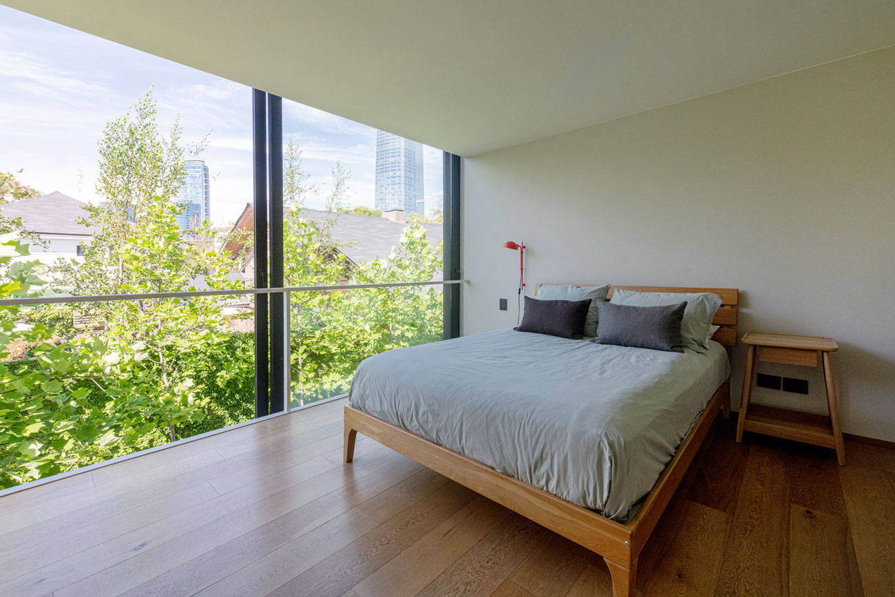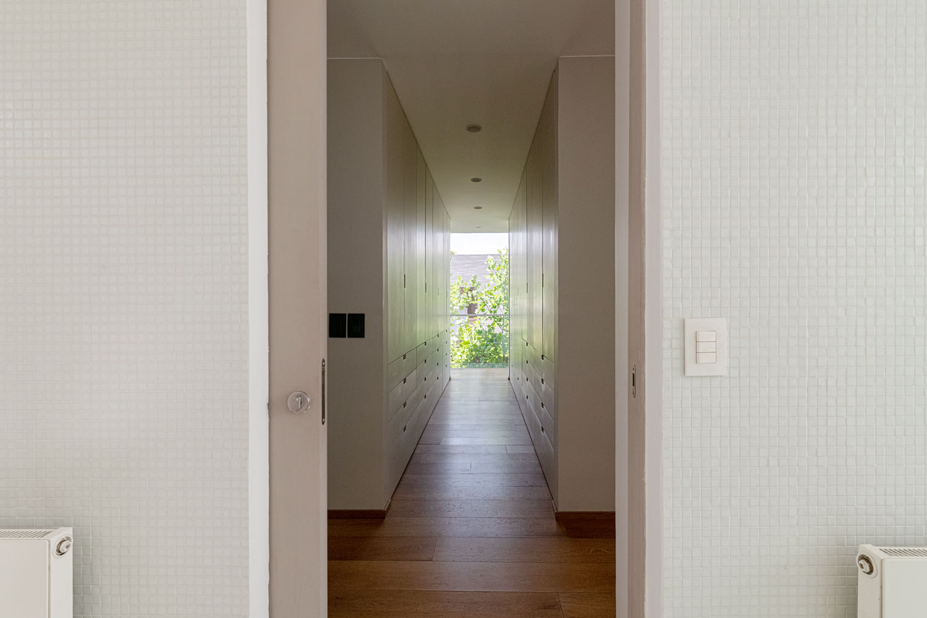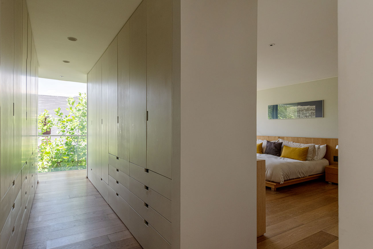 Hacia el sur del pasillo se encuentra el dormitorio principal, donde inmediatamente encontramos un gran walk in closet y un amplio baño con imponentes ventanas de cielo a piso desde donde se ven crecer los árboles tuliperos del jardín; entregando la sensación de estar en un bosque. La luz natural de un techo vidriado otorga calidez a una gran tina. Este sector tiene salida a un pequeño patio.
