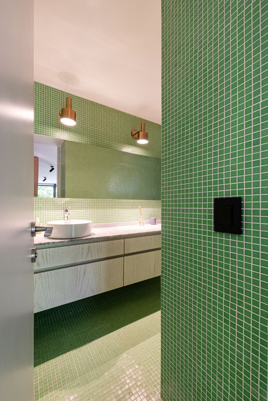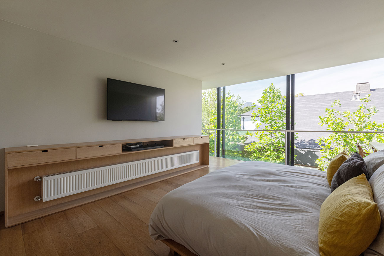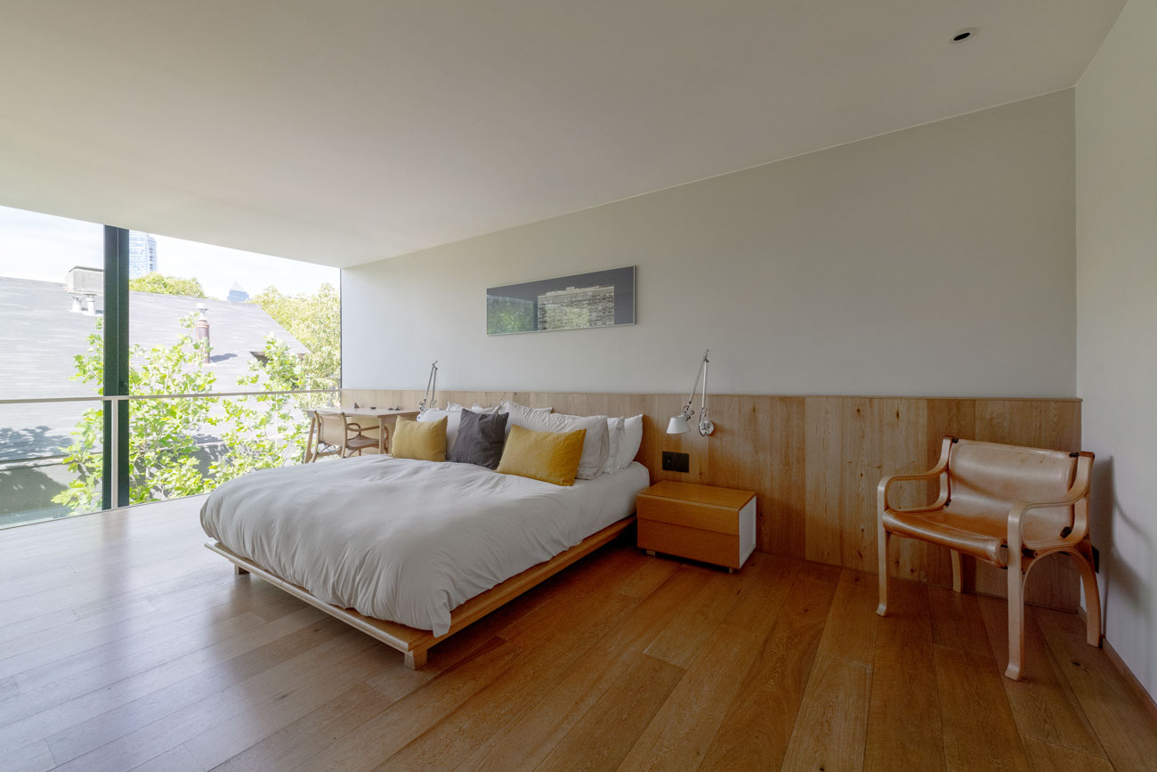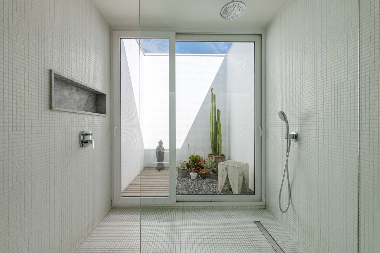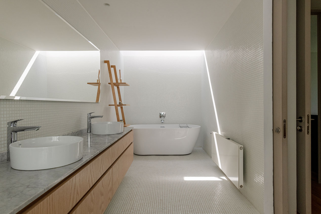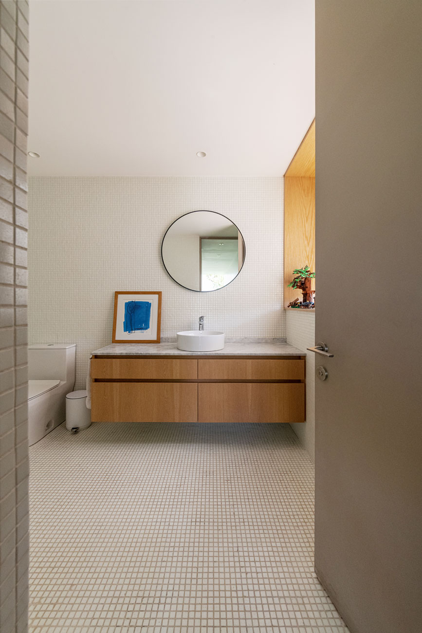 Hacia el sur del pasillo se encuentra el dormitorio principal, donde inmediatamente encontramos un gran walk in closet y un amplio baño con imponentes ventanas de cielo a piso desde donde se ven crecer los árboles tuliperos del jardín; entregando la sensación de estar en un bosque. La luz natural de un techo vidriado otorga calidez a una gran tina. Este sector tiene salida a un pequeño patio.