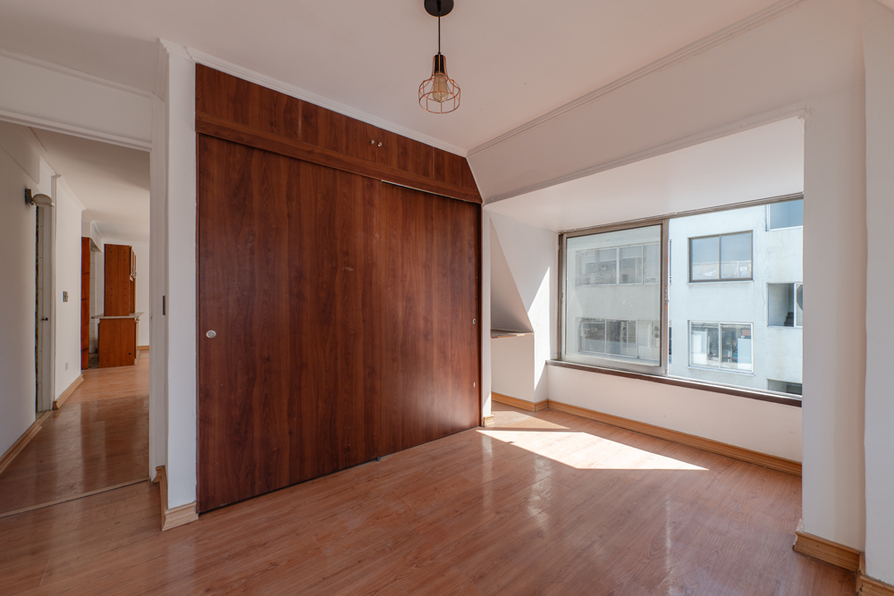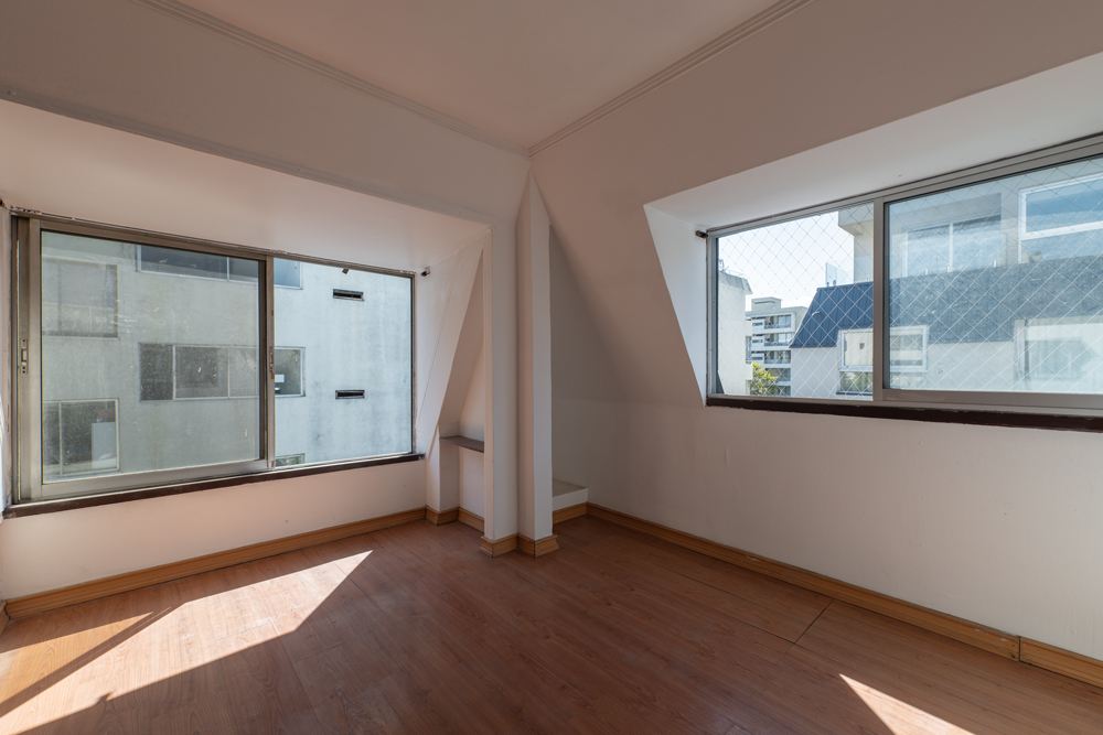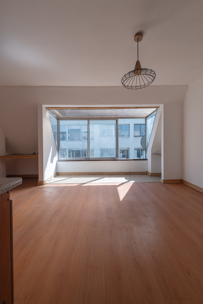 La propiedad, de casi 60 m2, está en el último piso, en un nivel tipo buhardilla, condición que le confiere un carácter singular. La techumbre inclinada y la escala de sus espacios generan una atmósfera acogedora y con gran personalidad. Su altura y su orientación norte y oriente permiten excelente luminosidad, mayor privacidad y menor exposición al ruido.