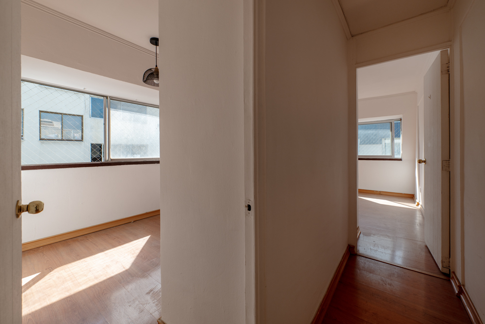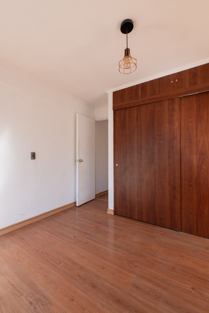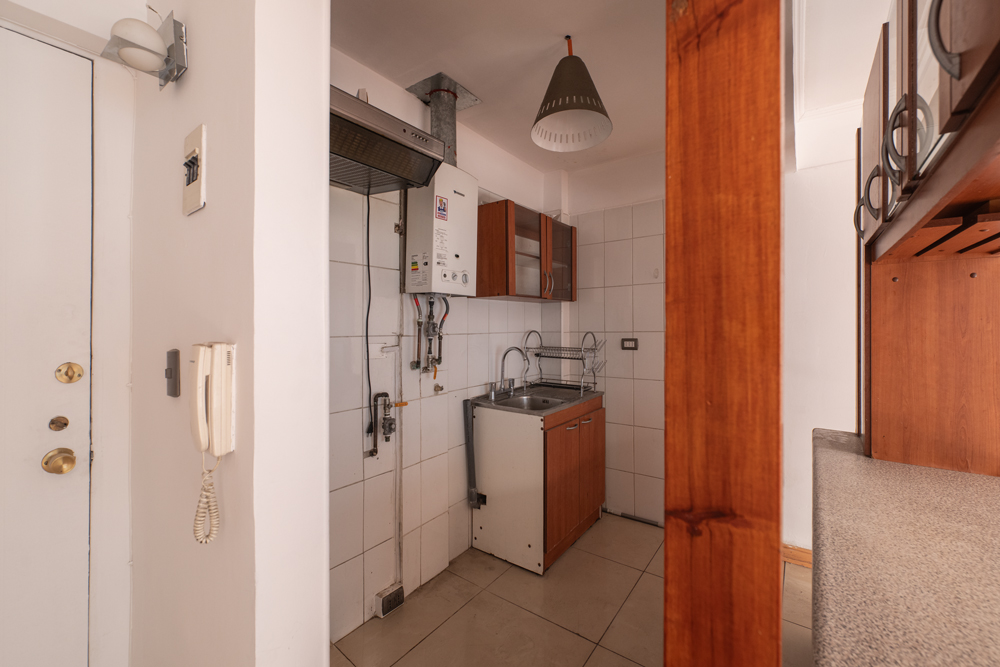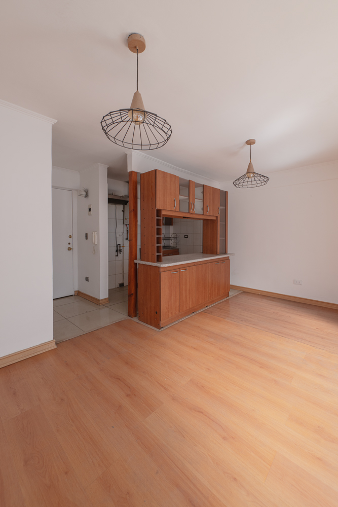 La planta se distribuye en un espacio abierto que integra living, comedor y cocina, además de dos dormitorios con closets integrados, que comparten un baño completo. El departamento ofrece gran potencial de remodelación, permitiendo adaptarlo a las necesidades y preferencias del futuro propietario.