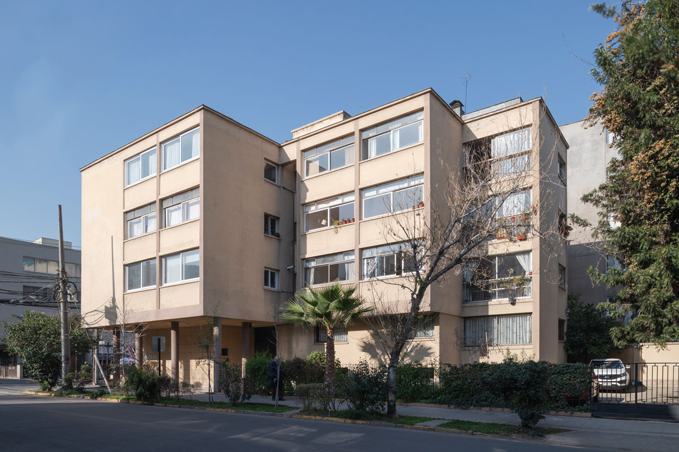 El edificio destaca por su fachada con ventanales horizontales y su acceso con pilares redondos que sostienen un segundo piso que hace de techo; una novedad arquitectónica para su época.