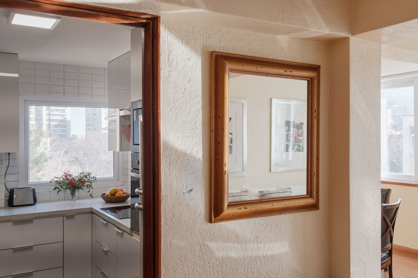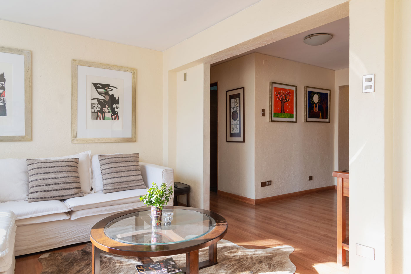 El departamento, situado en el cuarto piso sin ascensor, cuenta con 97 m² y es luminoso. Al ingresar por su hall de entrada se encuentra un pequeño baño de visita seguido por una cocina remodelada con cubiertas de granito y artefactos empotrados. Desde ahí accedemos a un dormitorio y baño de servicio que por su amplitud es actualmente utilizado como escritorio.