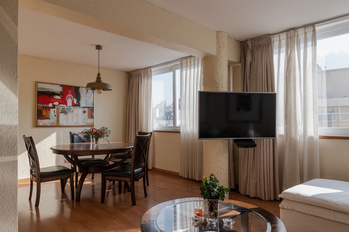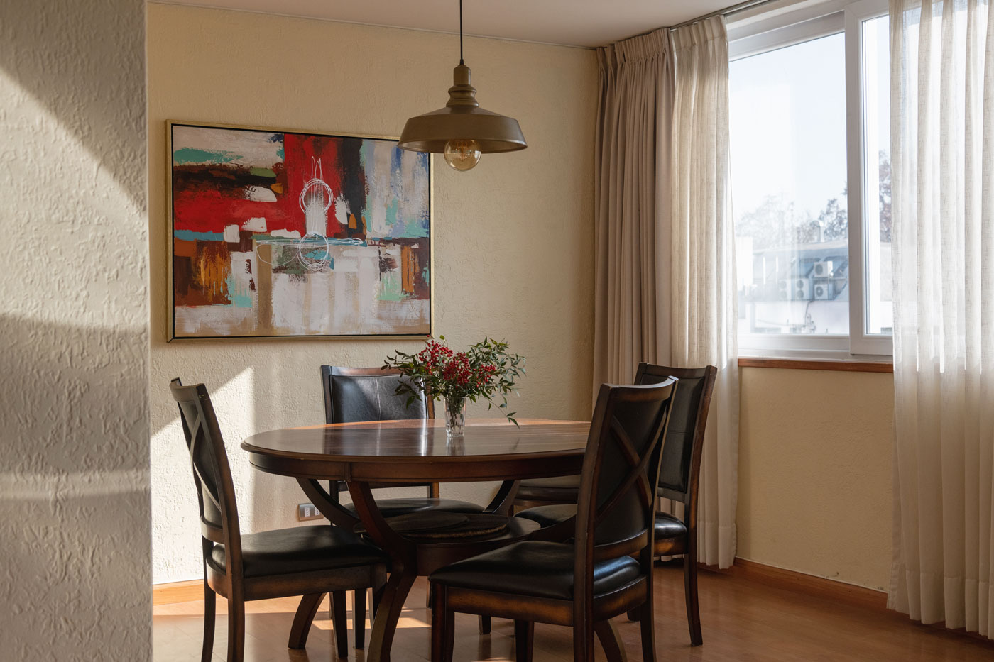 El amplio y cómodo living comedor ofrece una vista despejada hacia el norte y destaca por tener el mismo pilar redondo del acceso que se extiende desde el primer piso hasta el techo, aportando un elemento arquitectónico único al espacio.