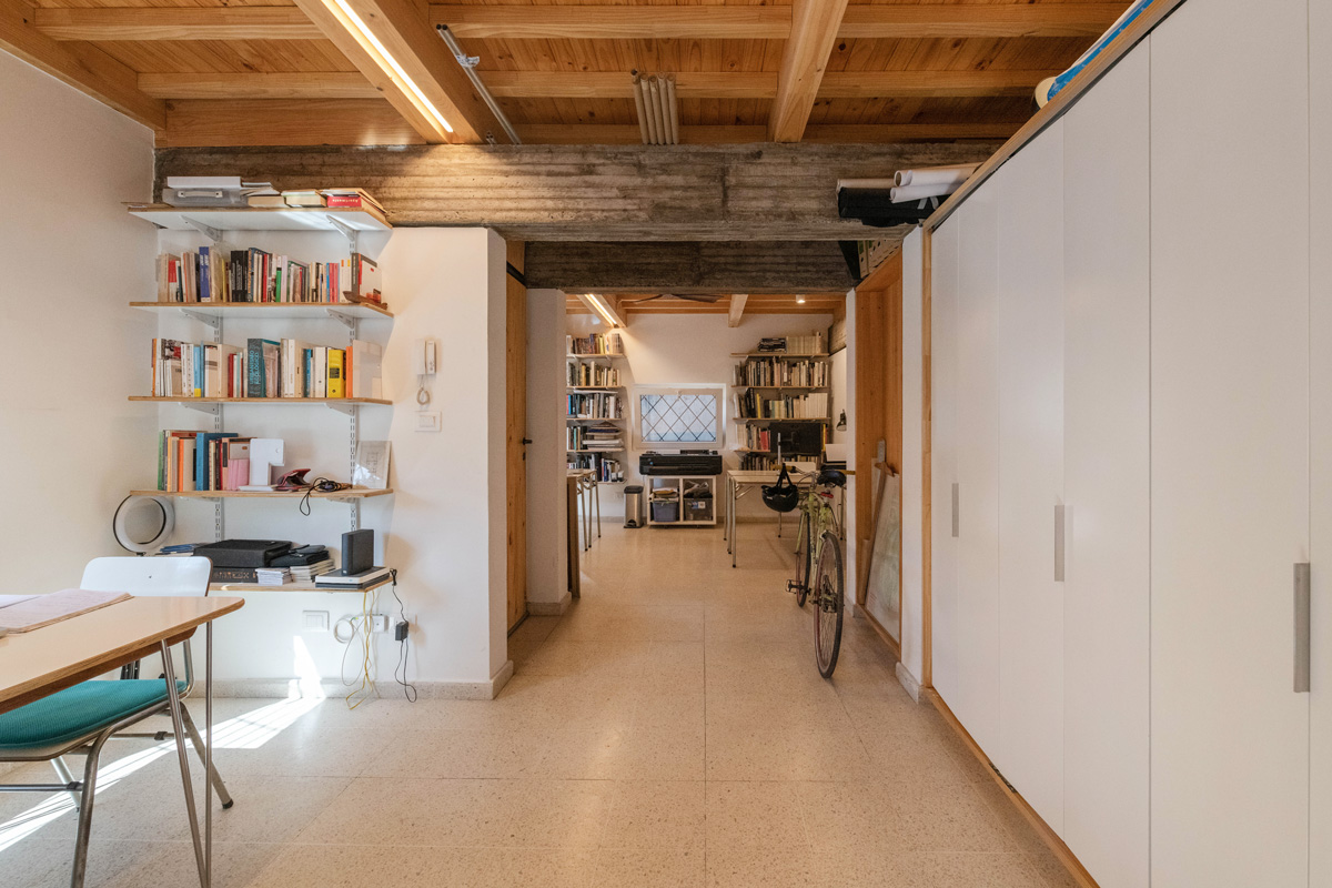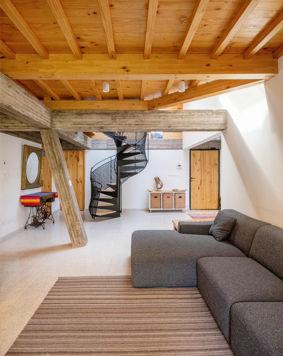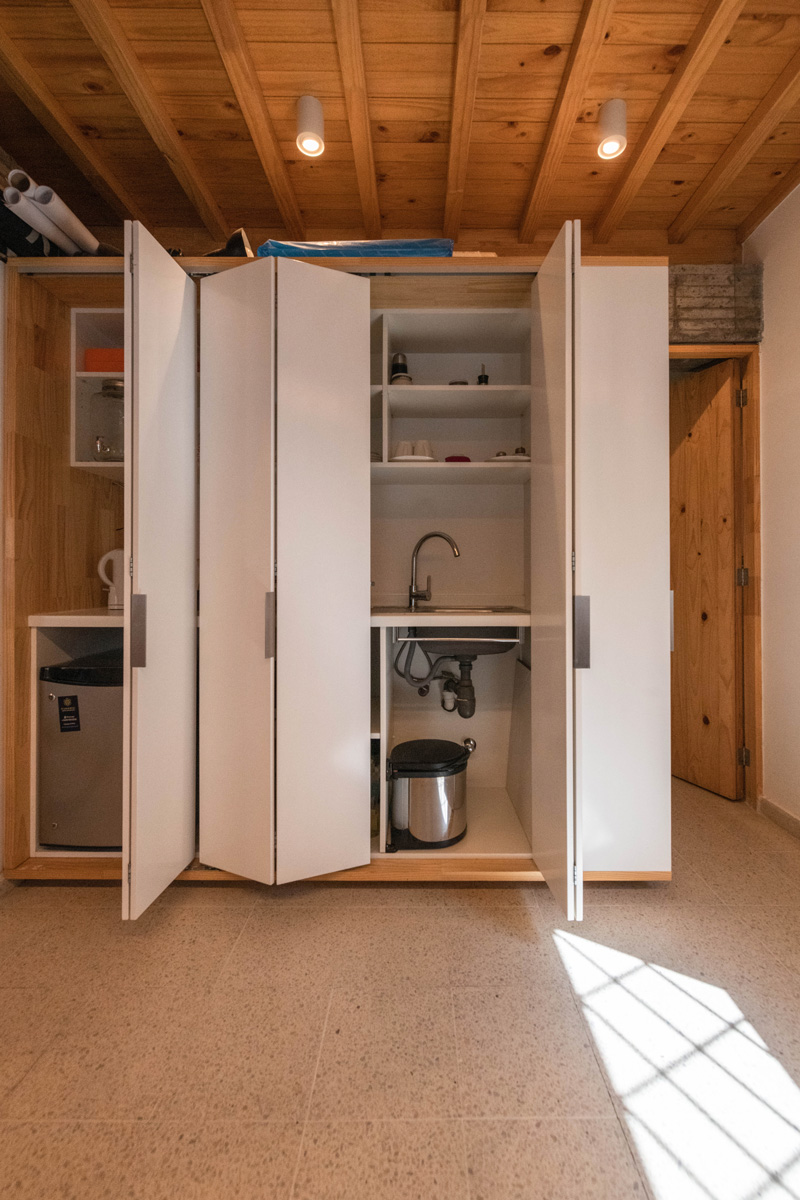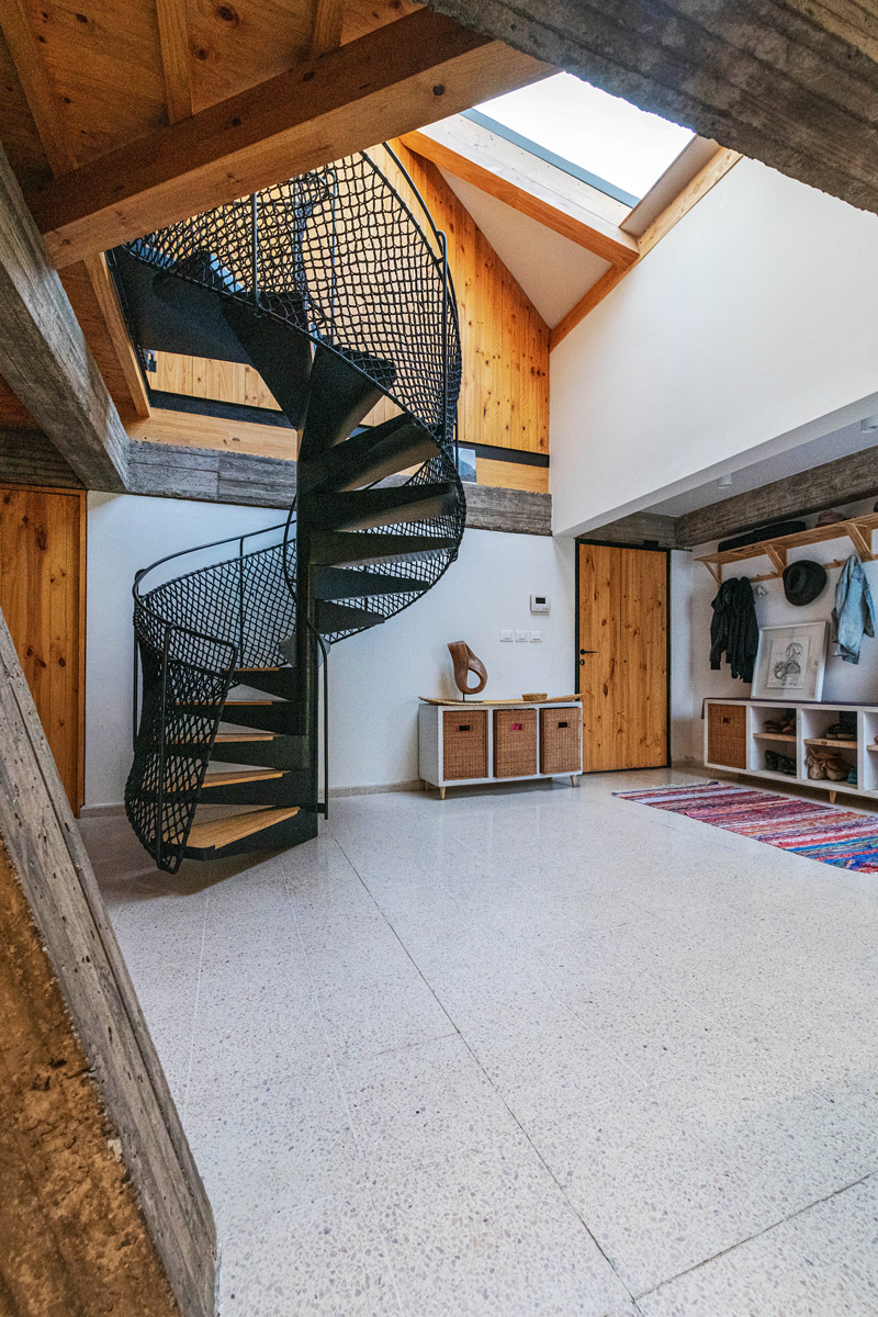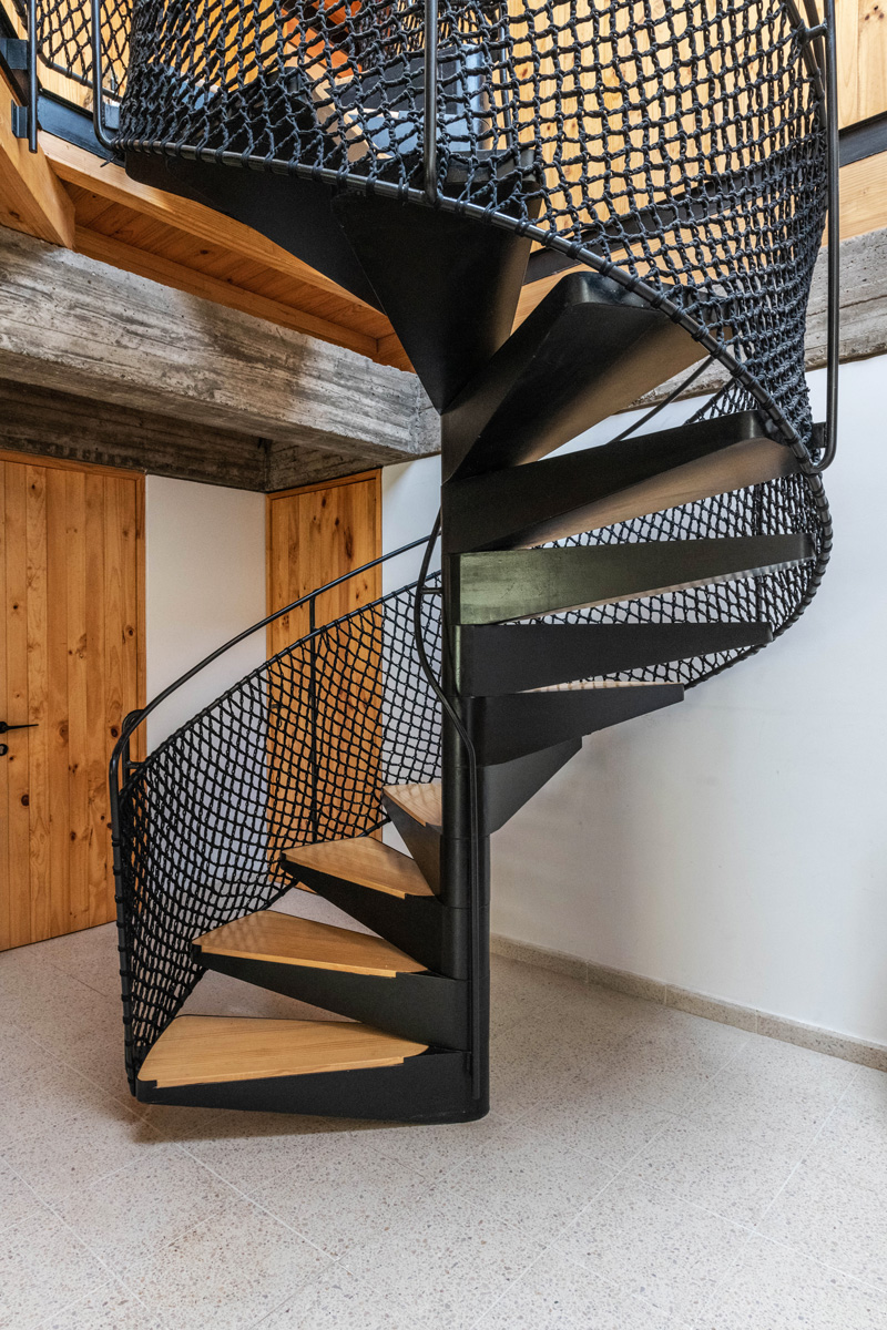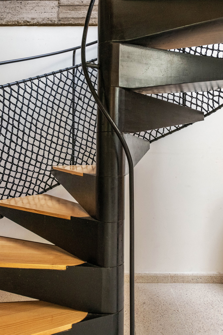 Por su parte, la casa, en su primer piso es una planta libre donde se encuentra el recibidor, el living comedor, la cocina integrada y un baño/logia. Todo emplazado en torno a una escala que sobresale como objeto vertical.
