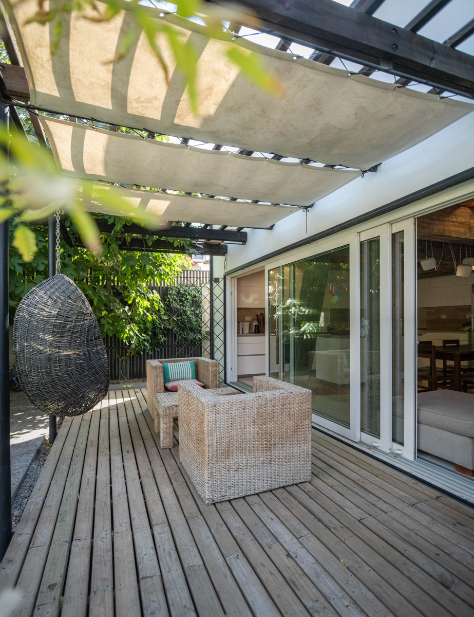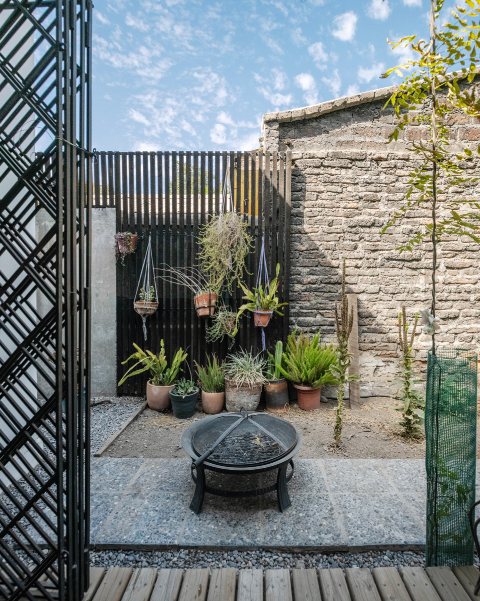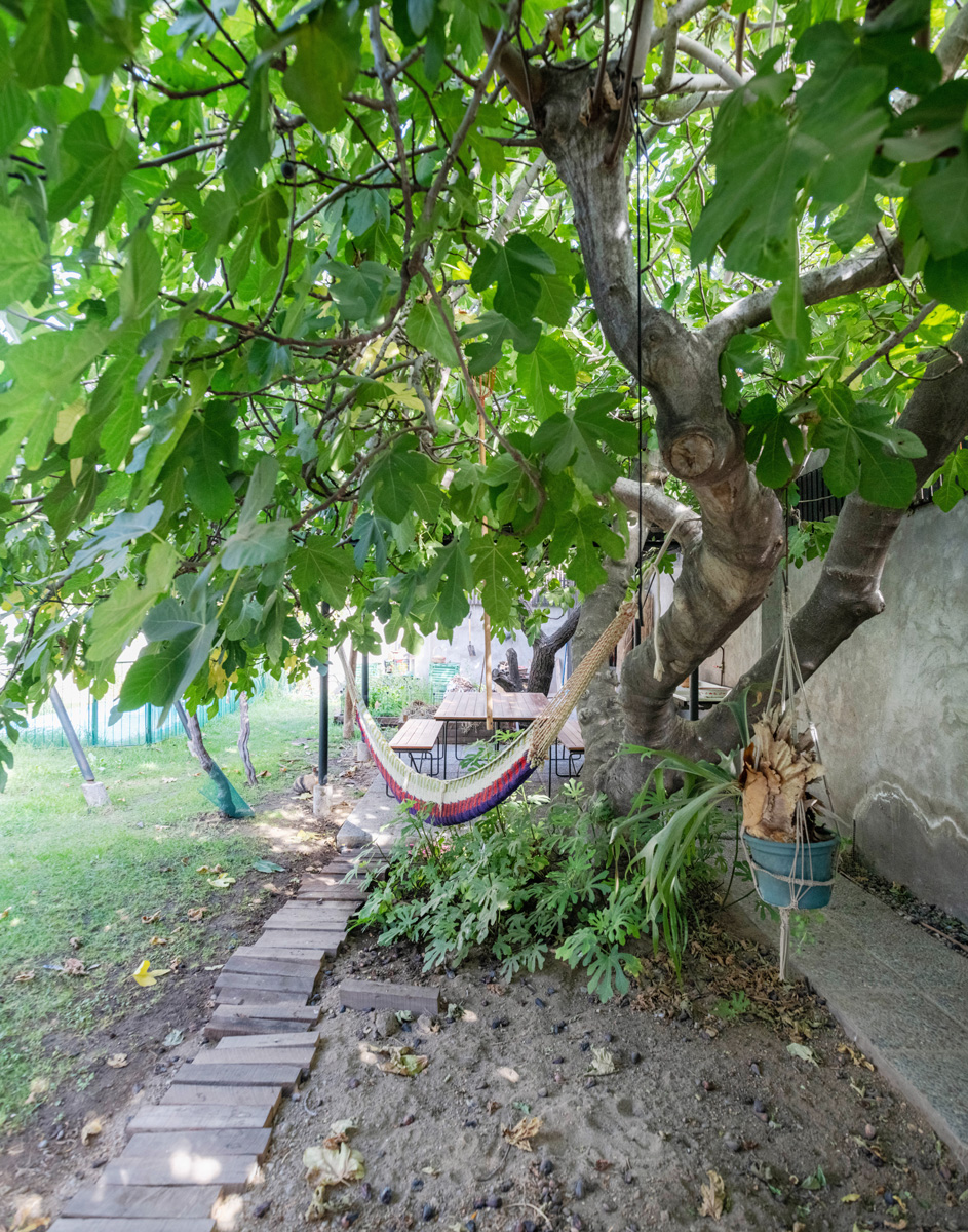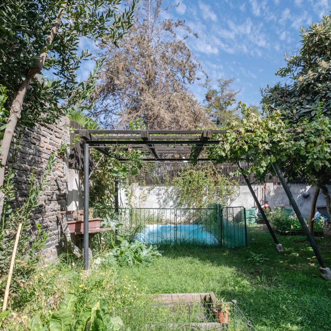 Desde esta primera planta accedemos al patio: un lugar lleno de vegetación, donde encontramos una terraza, una piscina y el quincho. Destacando una gran higuera, un damasco, un laurel y tres parras.